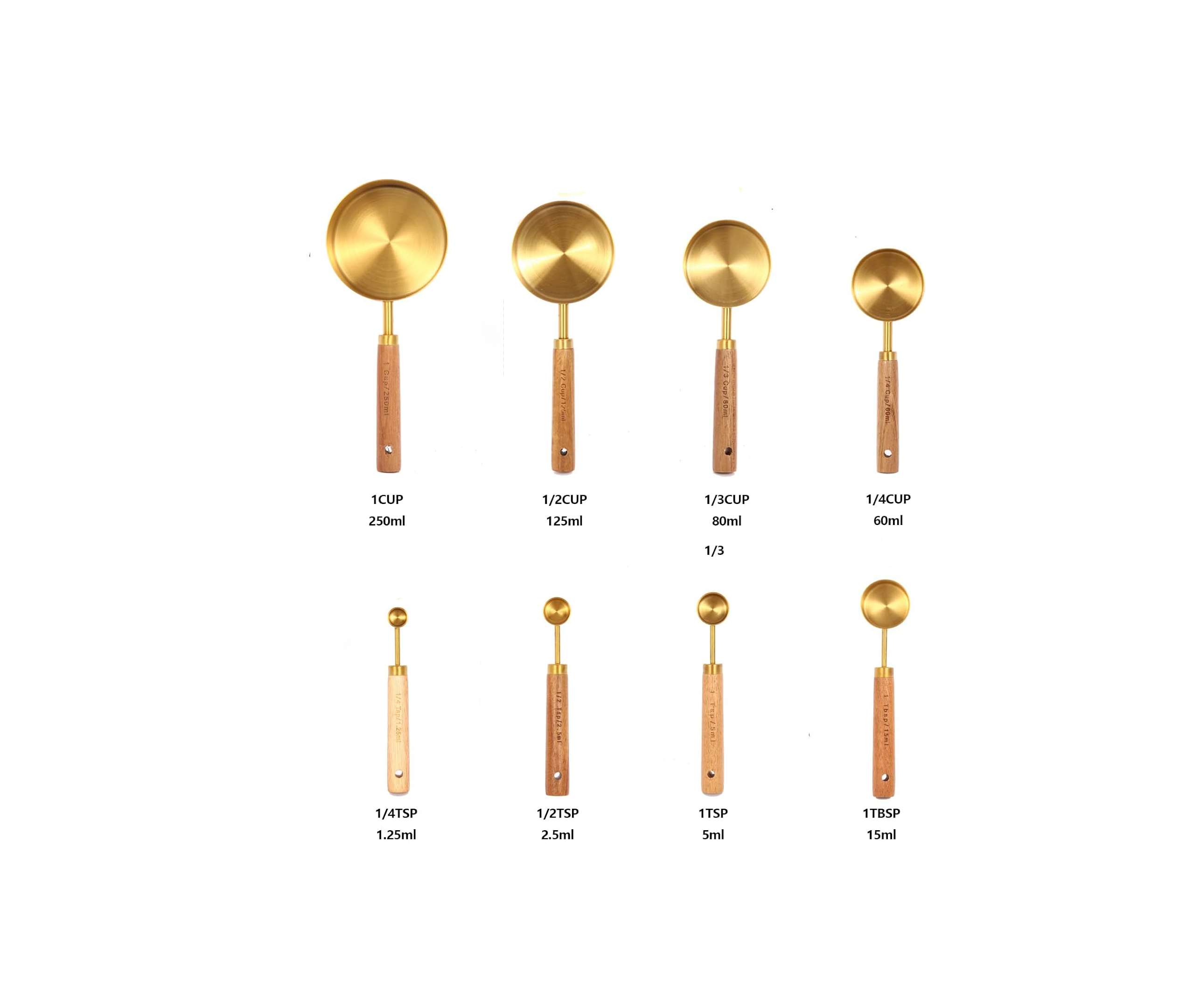 GOLD MEASURING CUPS AND SPOONS SET WITH WOOD HANDLES – 8 PIECES STAINLESS STEEL