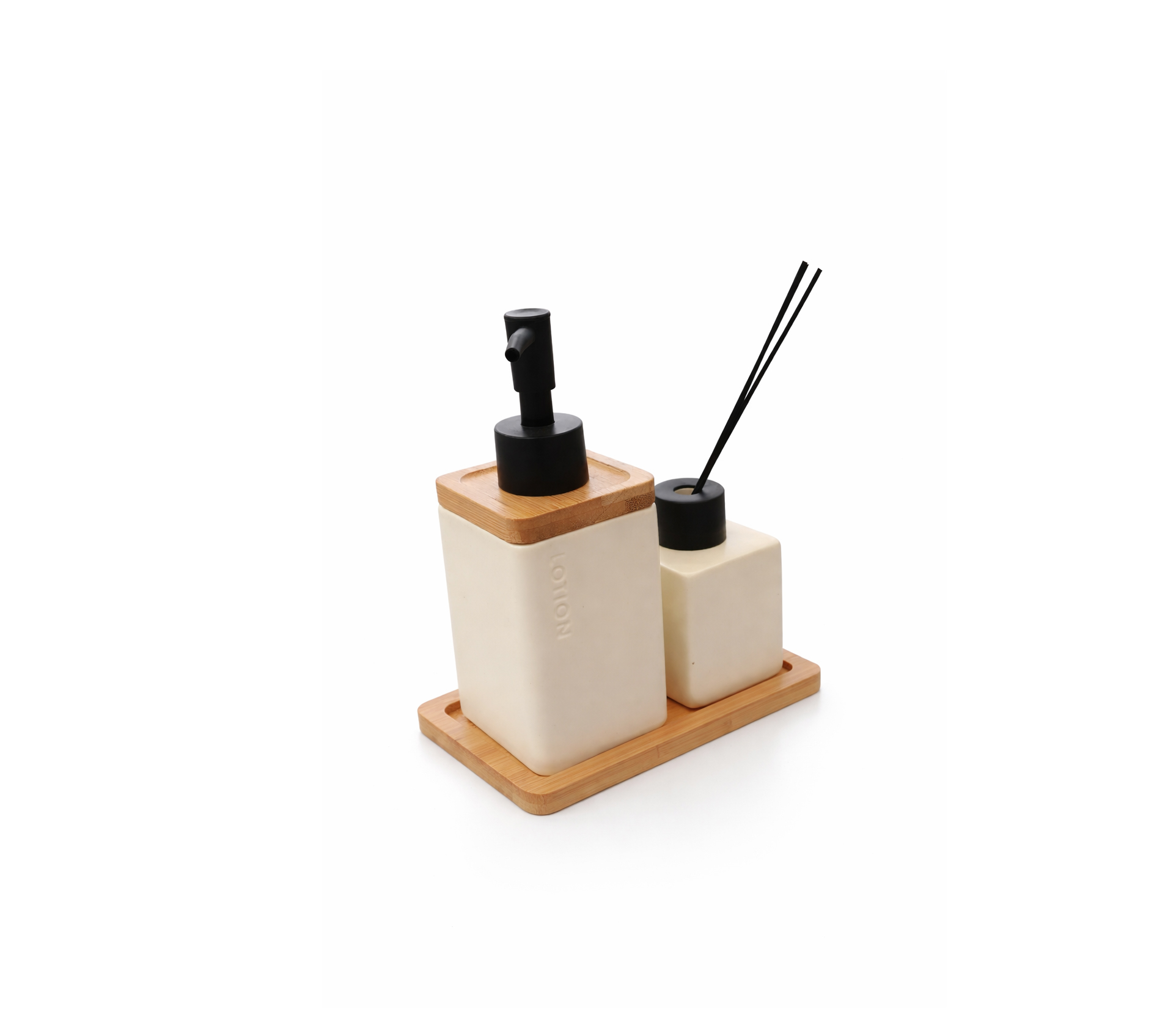 Upgrade your bathroom with a touch of natural elegance and modern simplicity! This beautifully designed bathroom set combines clean white ceramic with warm bamboo accents to create a stylish and calming atmosphere. Featuring a sleek lotion dispenser and a matching diffuser with wooden sticks, all placed on a refined bamboo tray, it offers both functionality and aesthetic appeal. Perfect for modern homes, this set keeps your essentials organized while enhancing your décor. Durable, easy to clean, and timeless in design—shop now from Homedash in Lebanon and bring sophistication to your space.