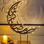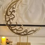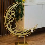 LARGE CRESCENT MOON WITH LED LIGHT – METAL DECOR WITH STAND – GOLD RAMADAN MOON