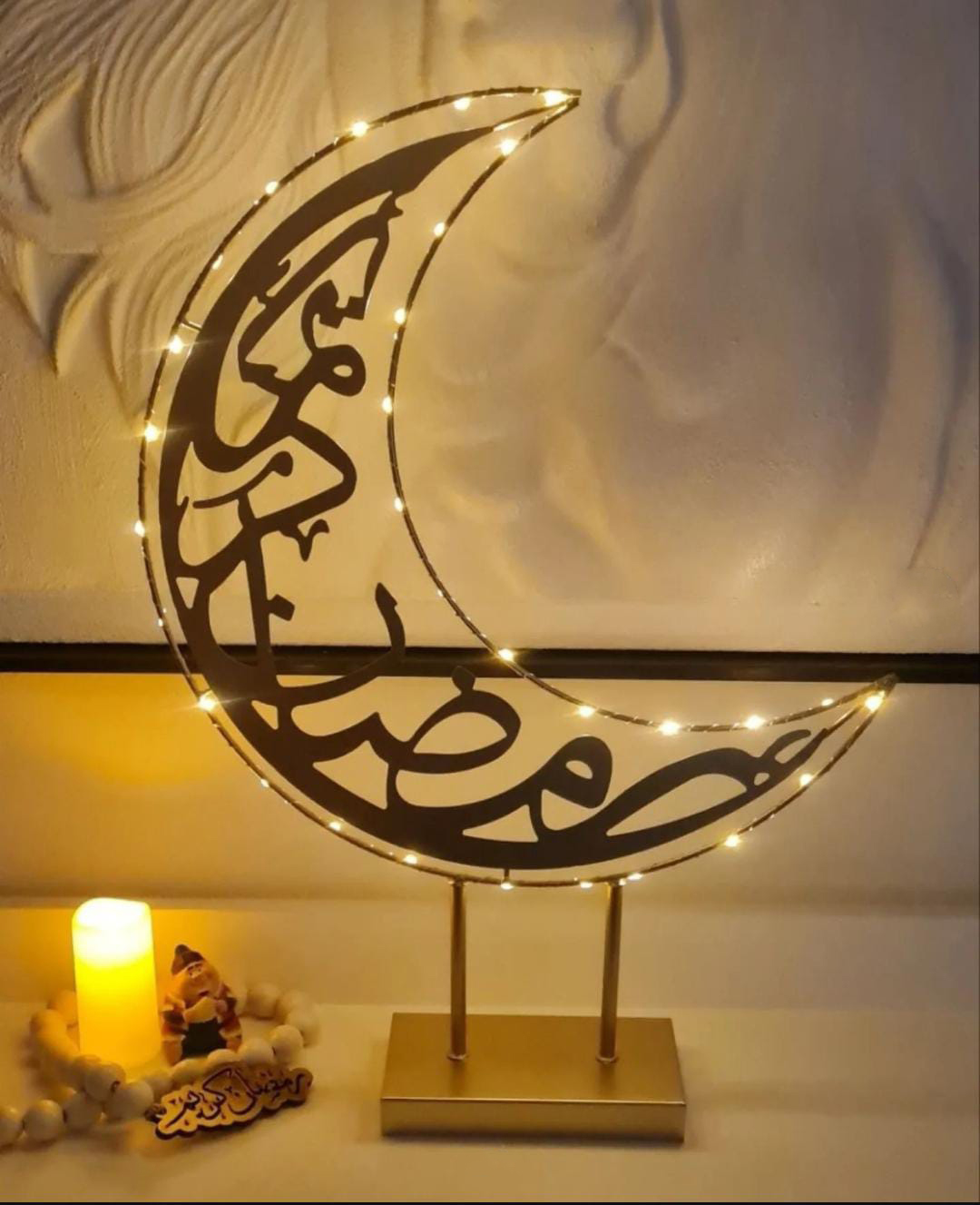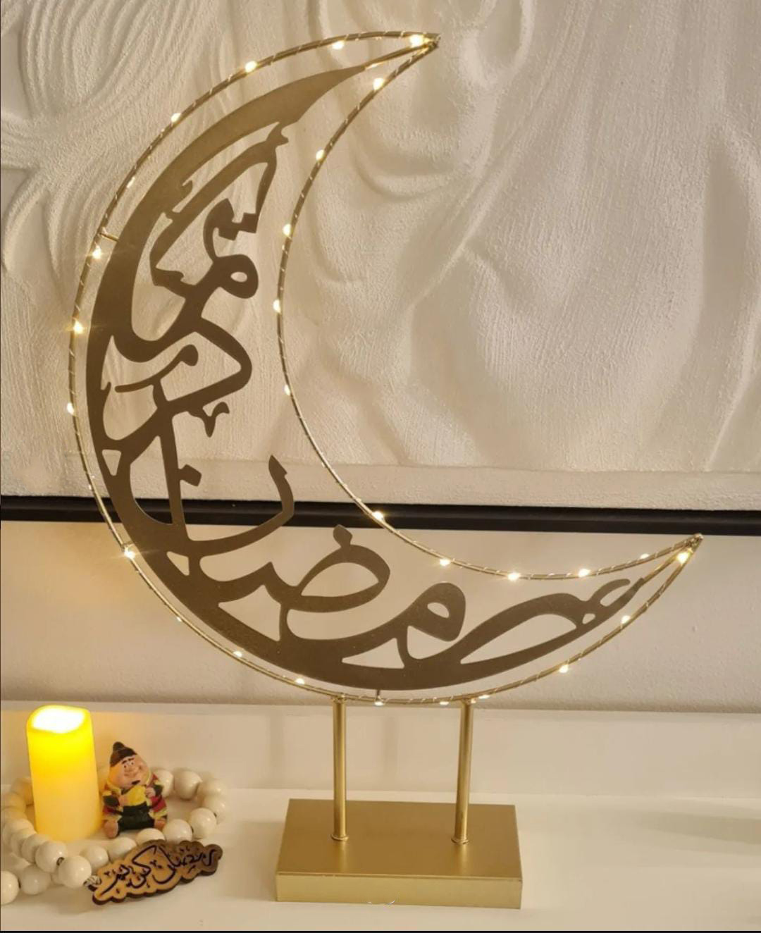 Large gold metal crescent moon with stand and warm LED light for Ramadan home and store decoration