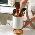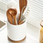 Organize your kitchen in style with the 360° Rotating Large Kitchen Utensil Holder, designed to keep your most-used cooking tools easily accessible. Made of premium ceramic with a beautiful ridged texture, this modern white utensil crock enhances any kitchen décor while offering excellent durability and stability. The detachable 360° rotatable wooden base allows smooth access to your utensils from any angle perfect for cooking, prepping, and baking. Its wide diameter and tall height provide ample space to hold 10–15 common kitchen tools, helping you maintain a clean and tidy countertop. A built-in non-slip cork mat protects surfaces from scratches and keeps the holder stable during rotation. Elegant, functional, and built to last, this utensil holder is the ideal addition to modern kitchens.