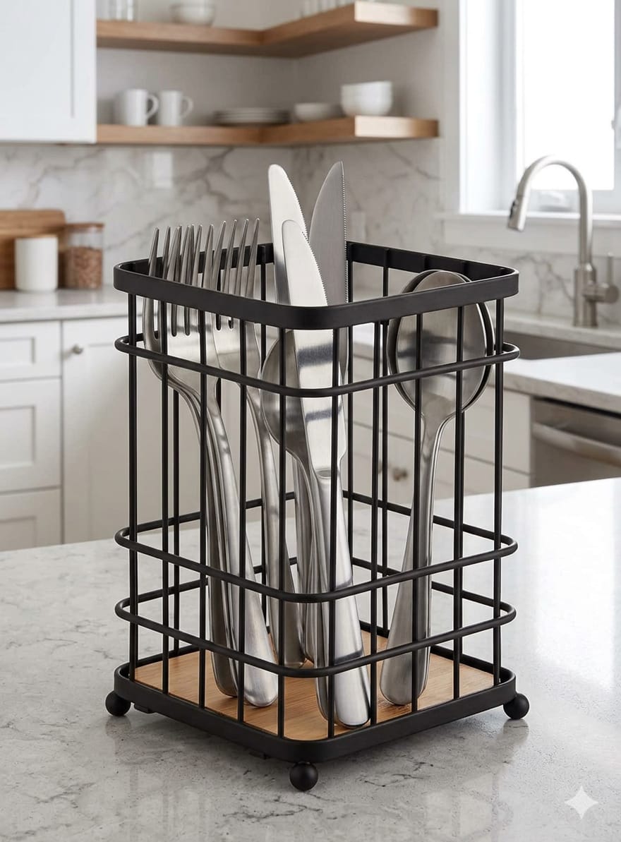 Bring modern organization to your kitchen countertop. The Dosthoff Iron Grid Cutlery Holder with Bamboo Base MB01 combines sleek matte black metal with natural bamboo for a stylish and functional storage solution. Designed to keep your cutlery and kitchen tools neatly arranged, this holder adds a contemporary decorative touch while improving everyday kitchen efficiency. Its open grid structure promotes airflow for faster drying, making it both practical and elegant for any kitchen space.