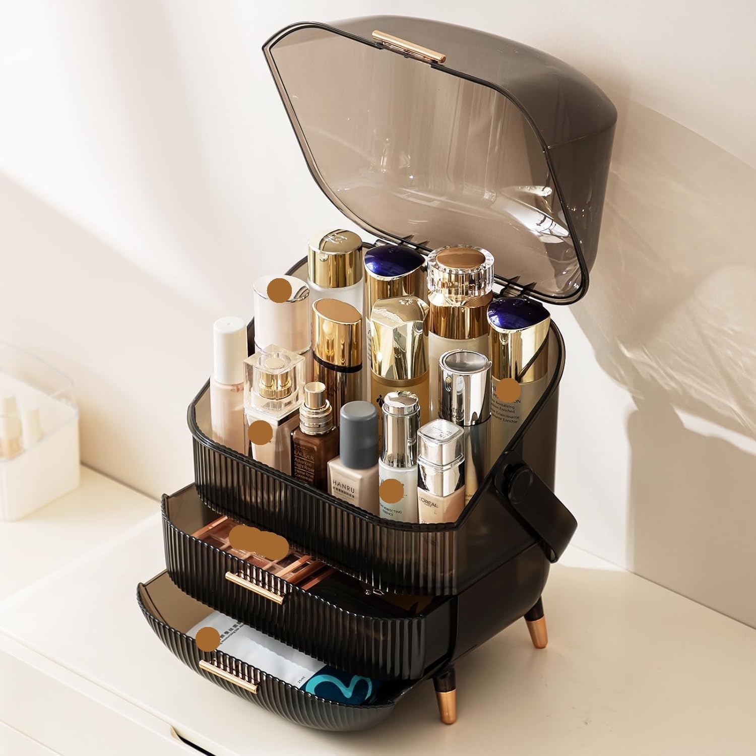 •3-Layer Storage: Holds tall bottles, skincare, makeup, and jewelry