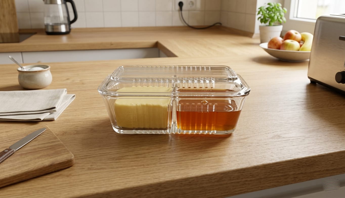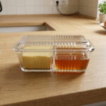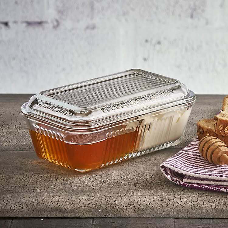 Pasabahce Frigo Studio double compartment glass container with butter and honey in a clear ribbed dish