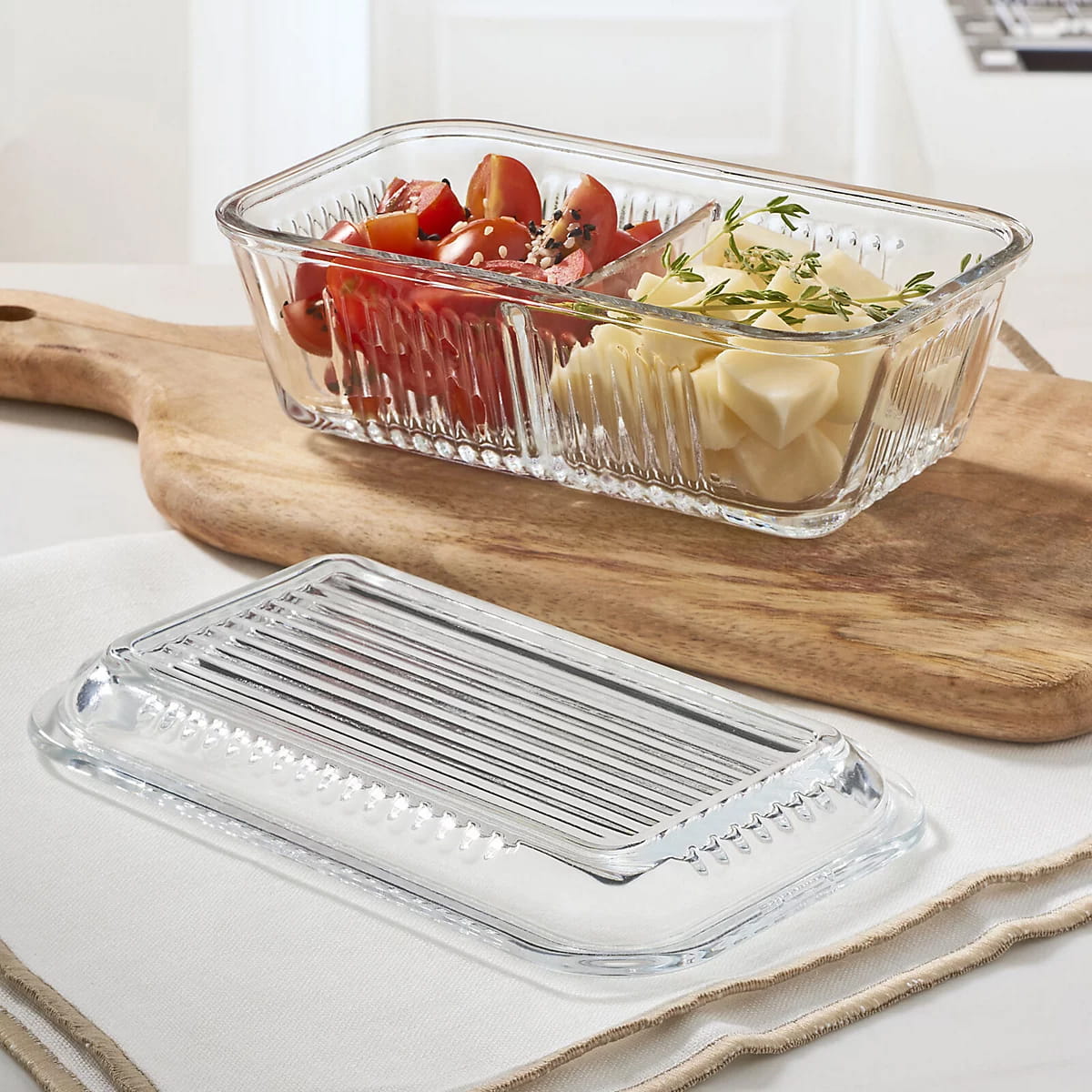 •Includes fitted glass lid for freshness