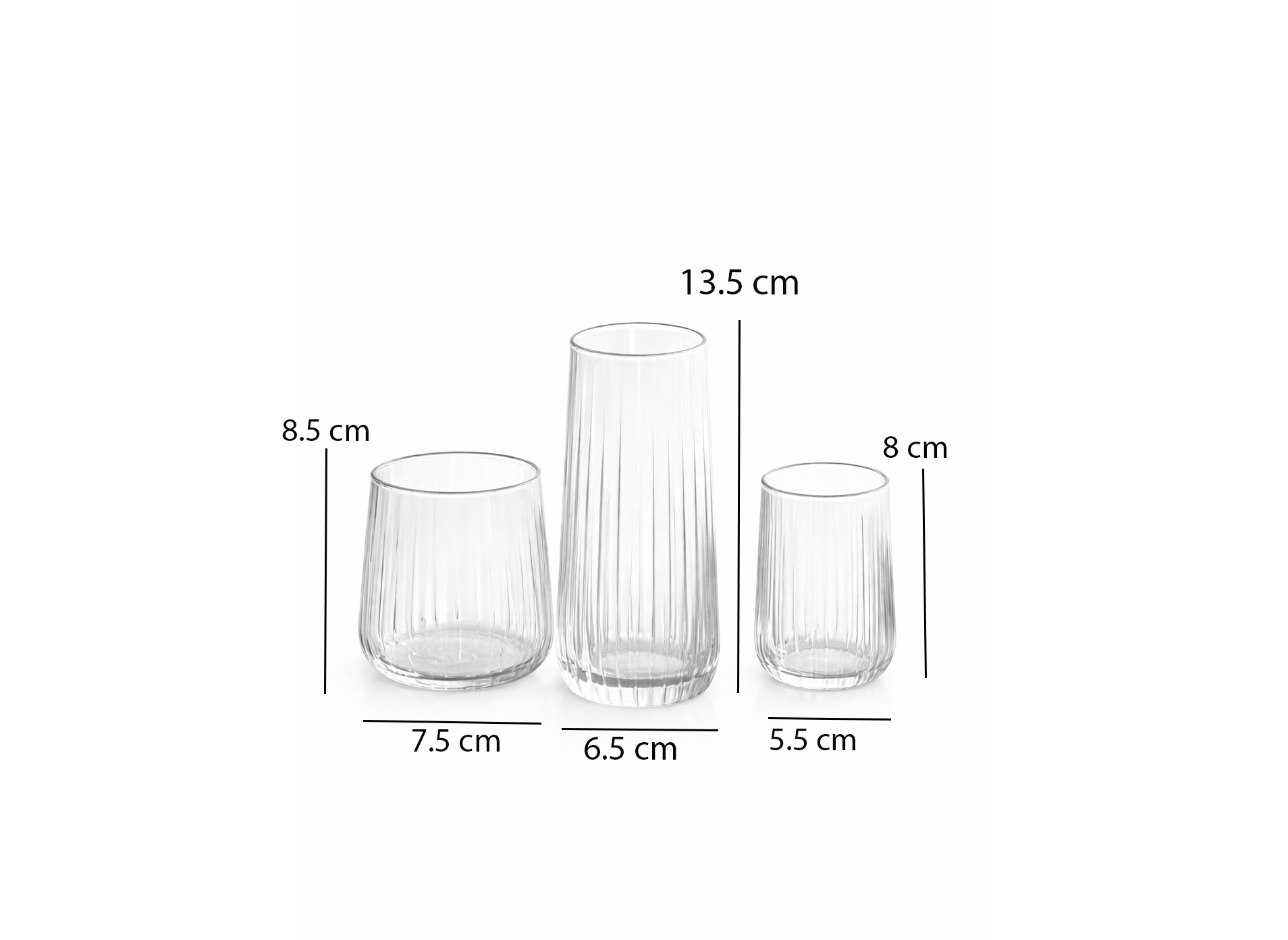 NOVA SET 18 GLASS CUPS – 6 SMALL, 6 MEDIUM, 6 LARGE – MODERN DRINKWARE SET