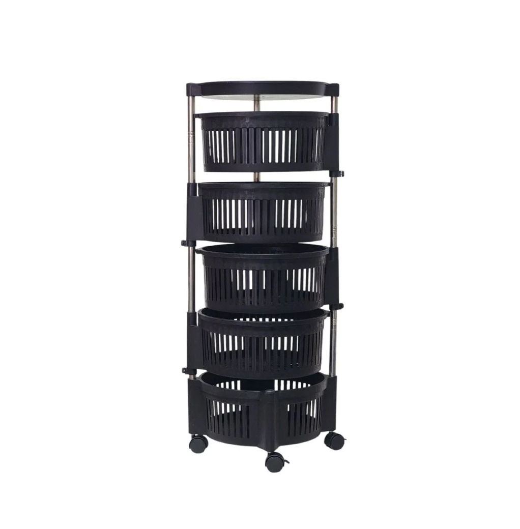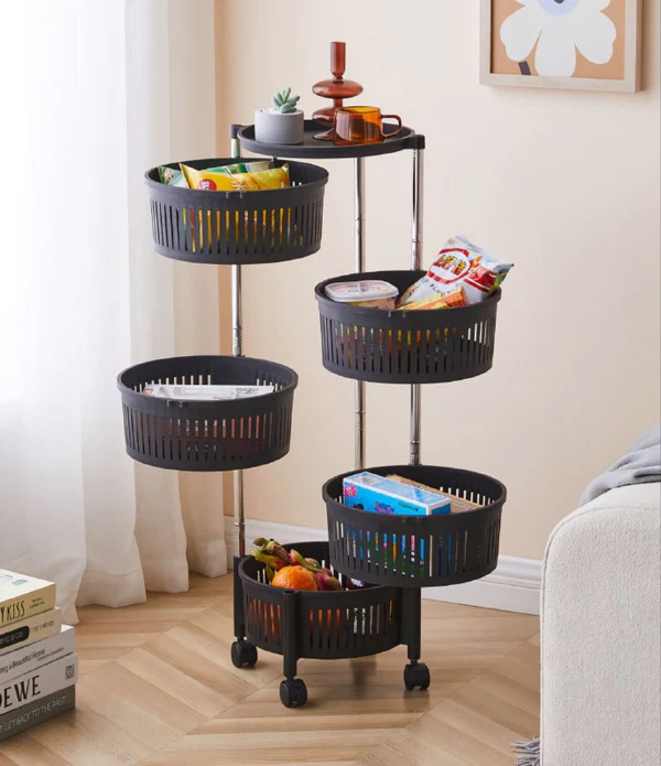 Organize your home effortlessly with smart storage. This 5-tier rotating storage organizer shelf is designed to maximize space while keeping your fruits, vegetables, and household items neatly arranged. The rotating baskets provide easy access from all sides, while the locking wheels allow smooth movement and stability wherever you place it. Perfect for kitchens, pantries, bathrooms, laundry rooms, or even bedrooms, this versatile cart offers practical storage with modern convenience.