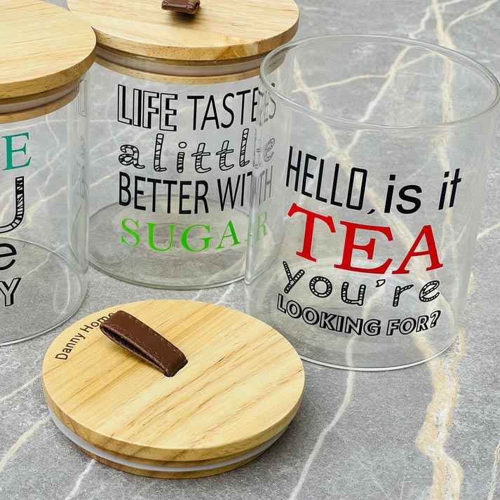 •Color: Clear glass with natural wood lids – 2 different Texts Set