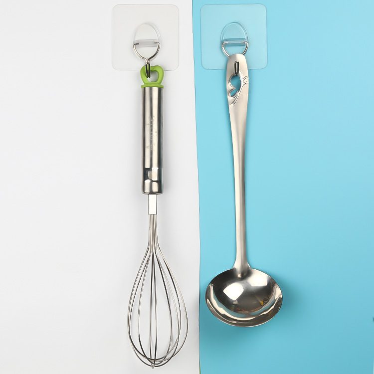 Set of 2 transparent adhesive wall hooks with stainless steel hooks holding a sponge and towel on a white background – strong removable wall hooks for kitchen and bathroom.
