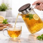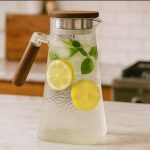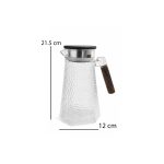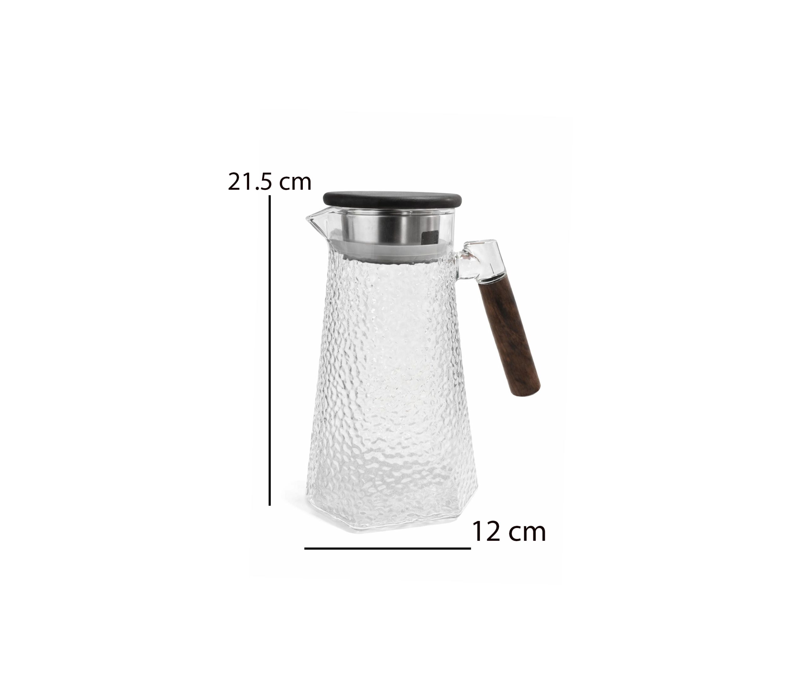 glass water pitcher with wooden handle, stainless steel filter lid and anti-drip spout for hot and cold beverages – available at Homedash Lebanon.