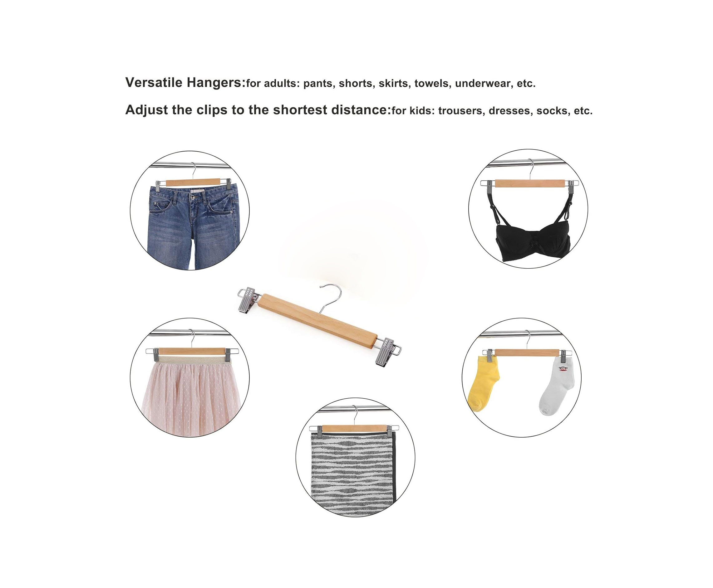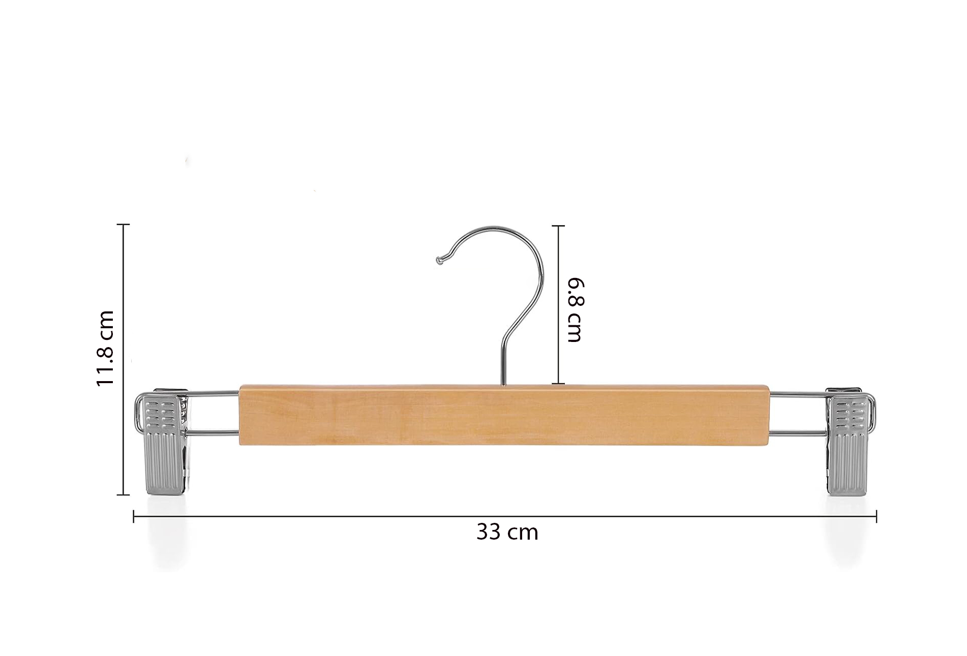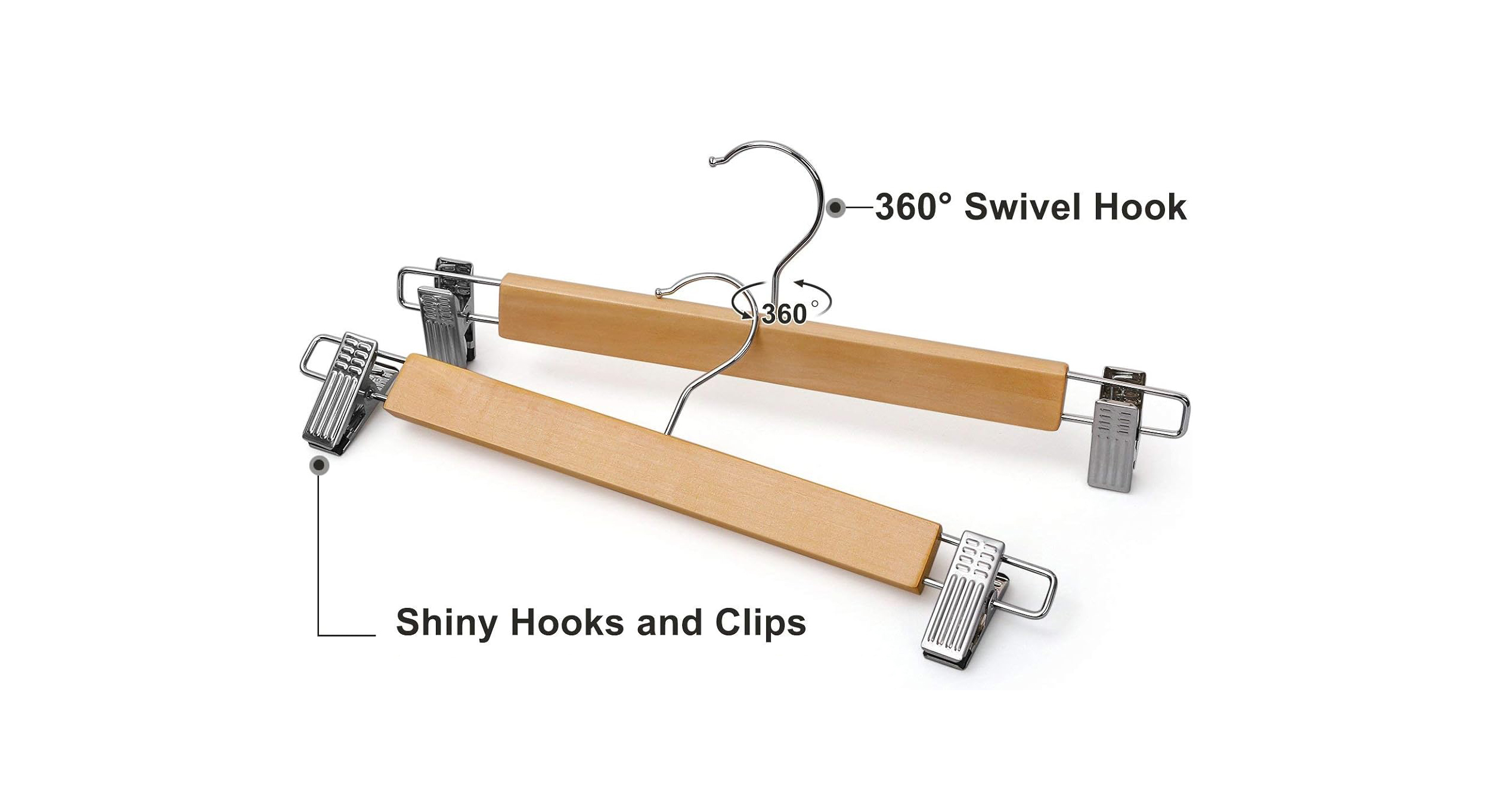 WOODEN SKIRT HANGER – PANT HANGER WITH CLIPS – ADJUSTABLE METAL CLIPS & 360° SWIVEL HOOK