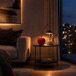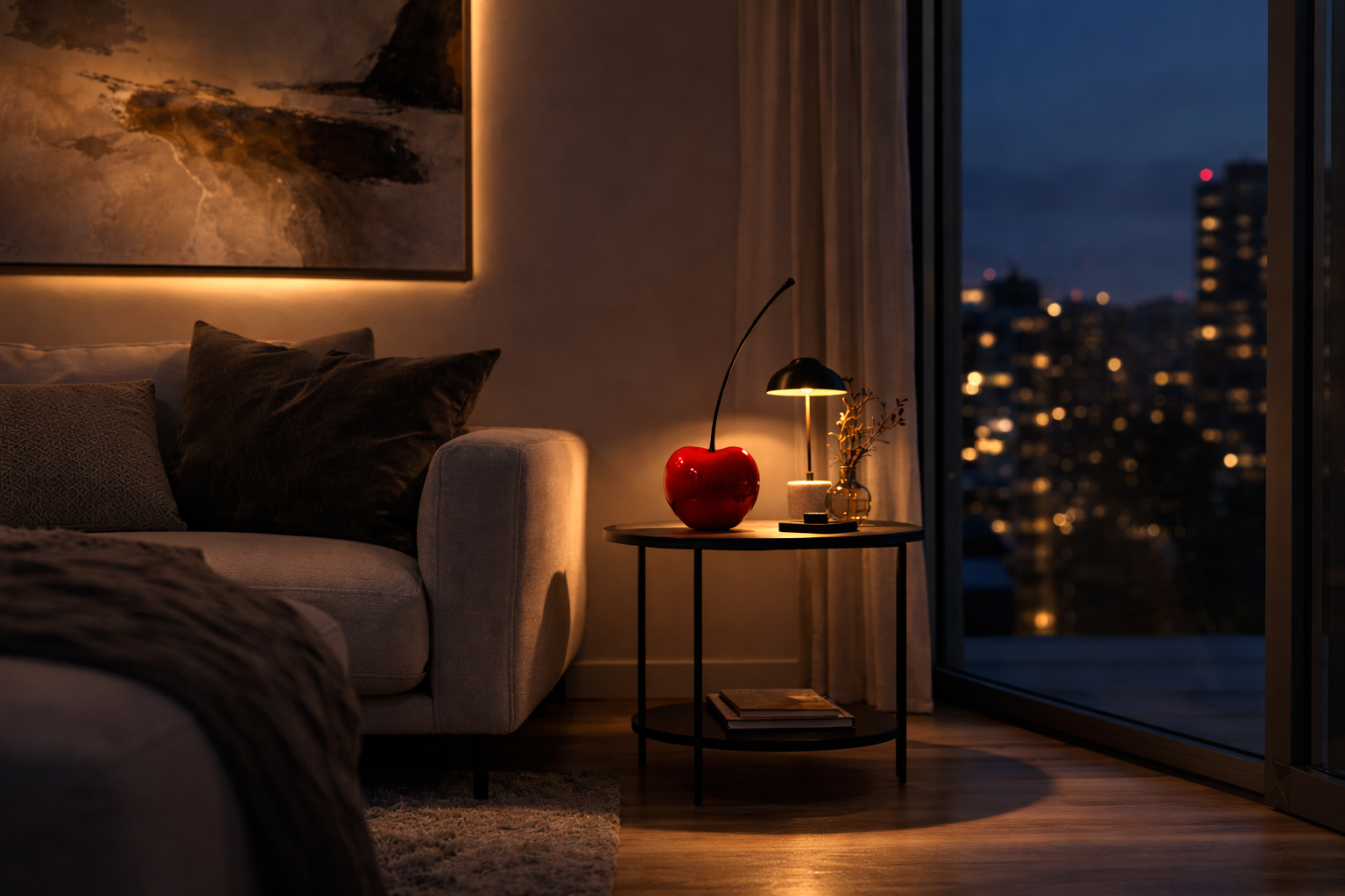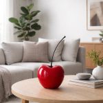 Glossy red ceramic cherry sculpture decorative piece on table in modern living room