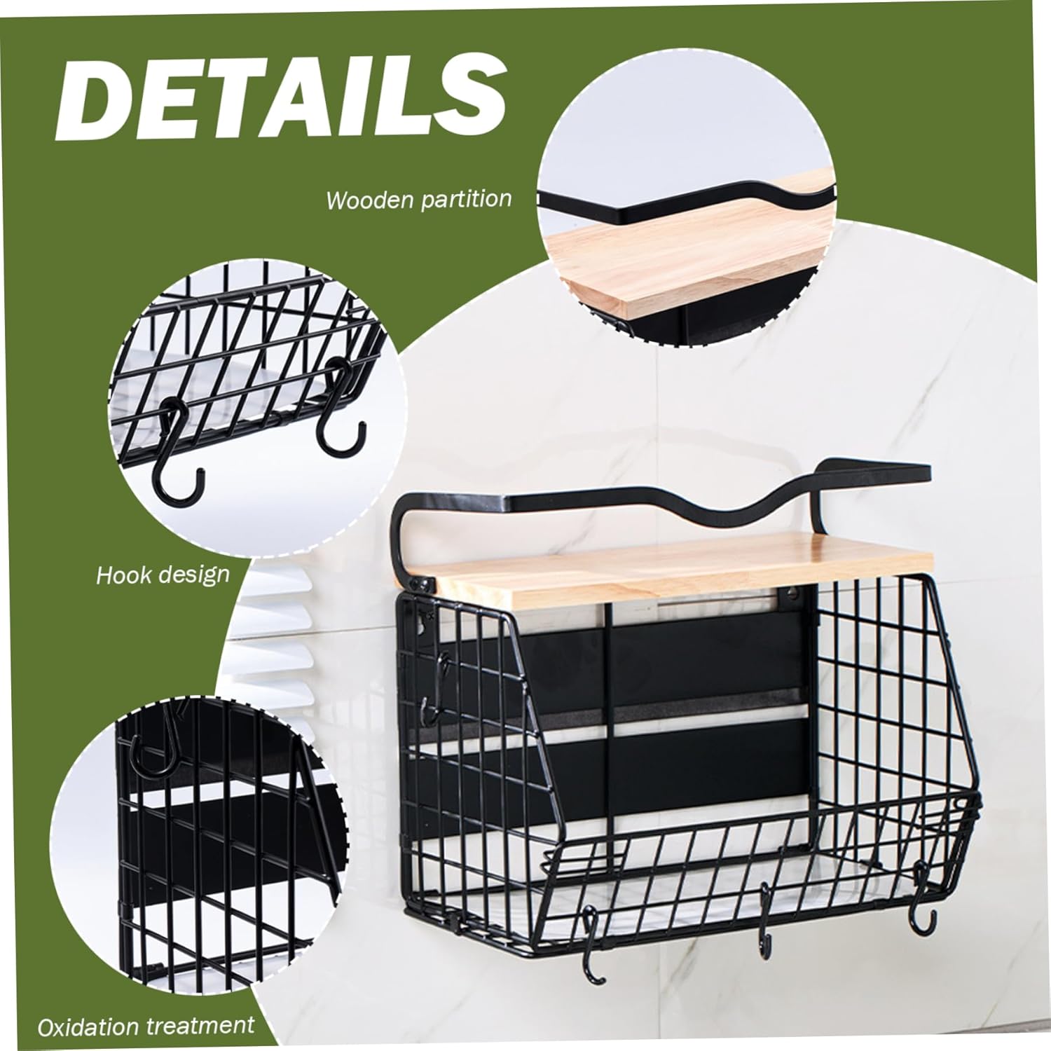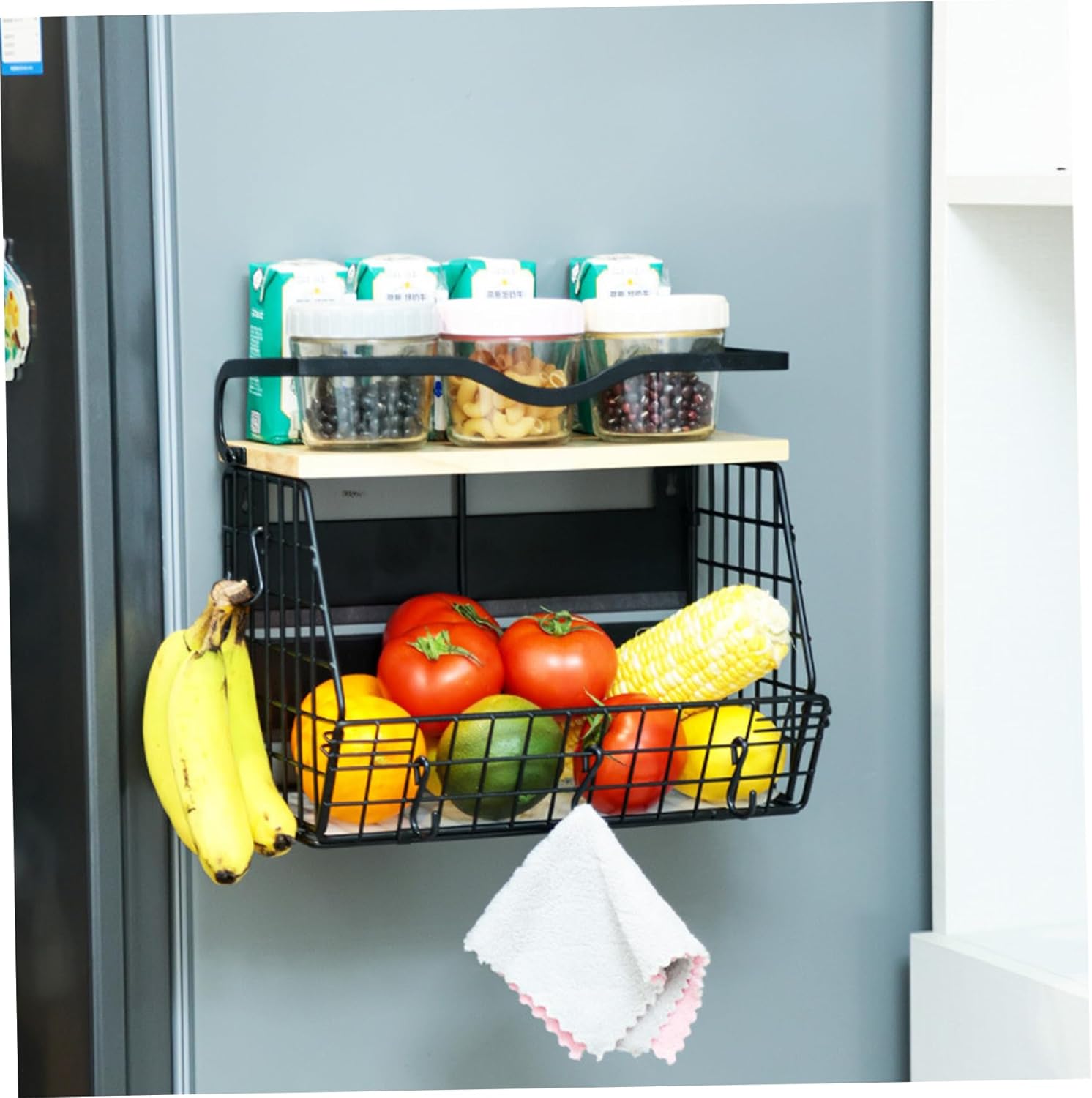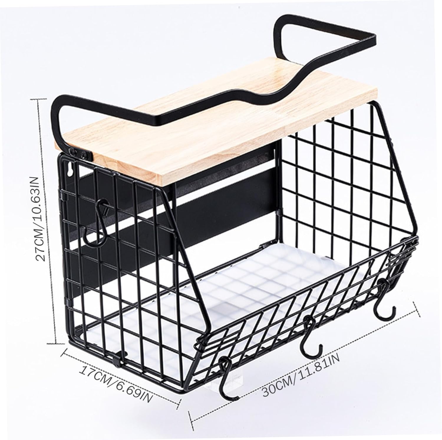 MAGNETIC FRIDGE SHELF WITH WOOD LID – HEAVY DUTY IRON STORAGE BASKET WITH 4 HOOKS