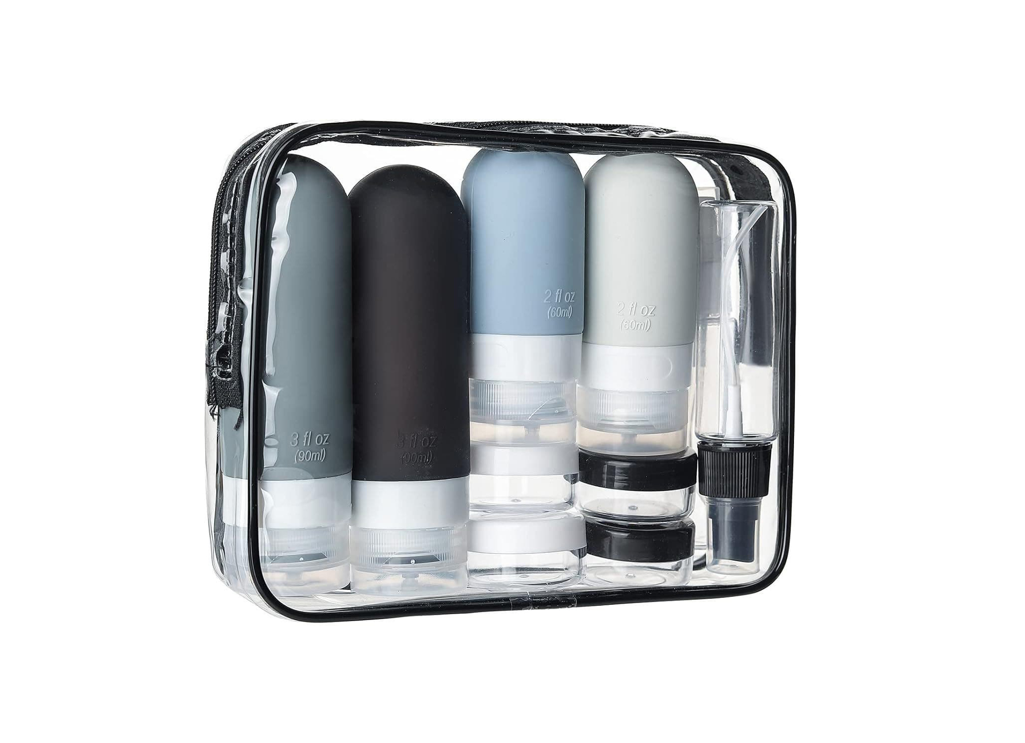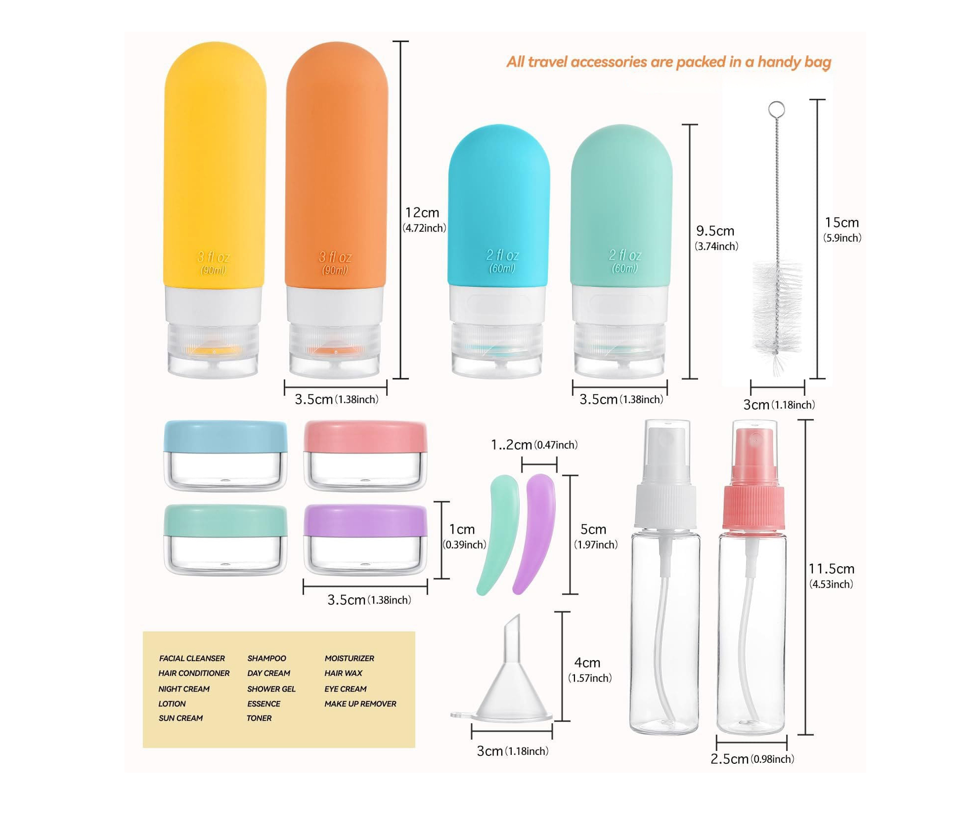 •Included in the Set (16 pieces): 4 × Travel Bottles (3oz silicone, squeezable & leakproof) – 4 × Travel Jars – 2 × Spray Bottles – 2 × Scoopers – 1 × Funnel – 1 × Cleaning Brush – 1 × Page of Labels – 1 × Clear Toiletry Bag (zippered)