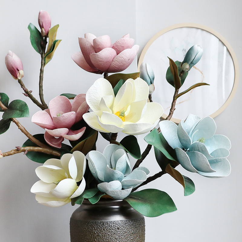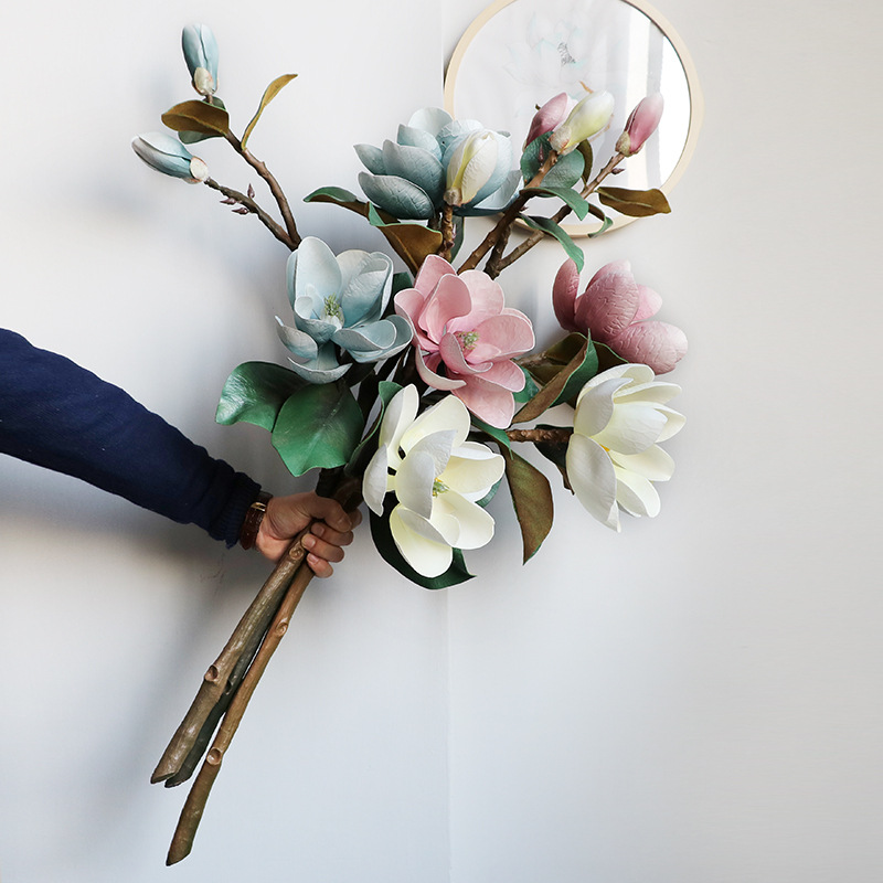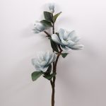 artificial magnolia flower stem with four silk blooms and green leaves 105 cm