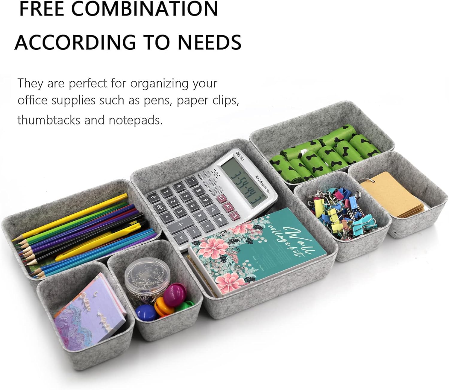 Declutter your drawers with style and smart organization. The Felt Drawer Organizer 7-Pack Set is the perfect solution for neatly arranging cosmetics, office supplies, and everyday essentials. Made from soft yet durable felt, these trays protect your items while keeping everything in place. With multiple sizes included, you can mix and match the trays to perfectly fit your drawer space. Ideal for desks, dressing tables, or kitchen drawers, this organizer set adds both functionality and a modern touch to your home.