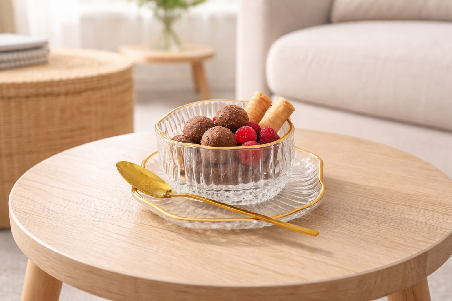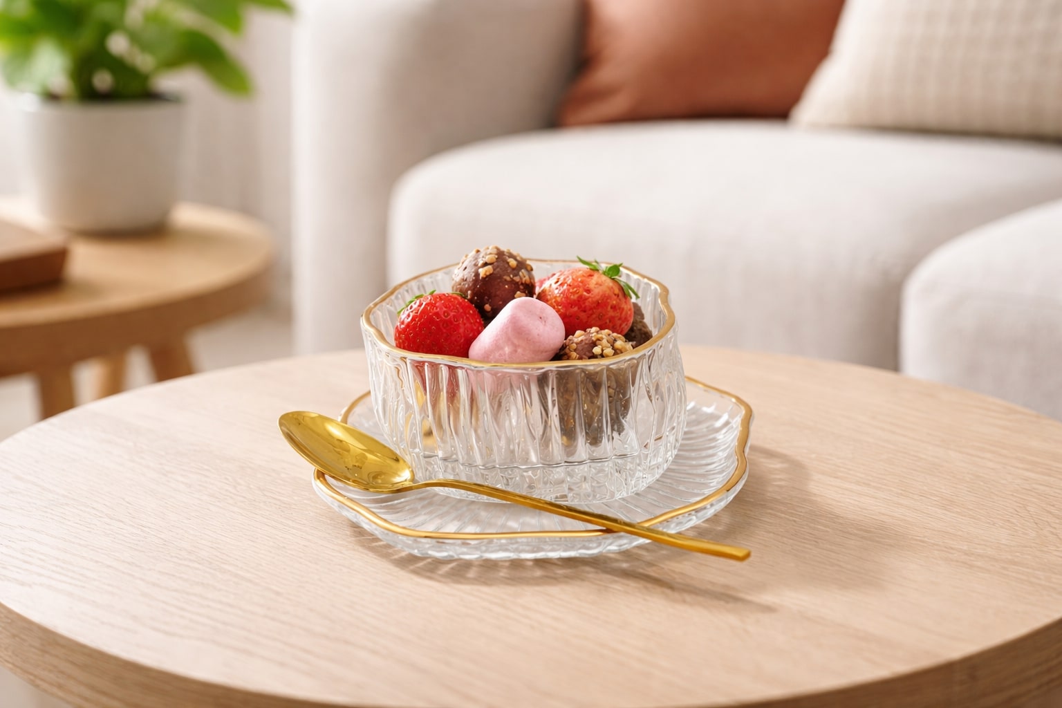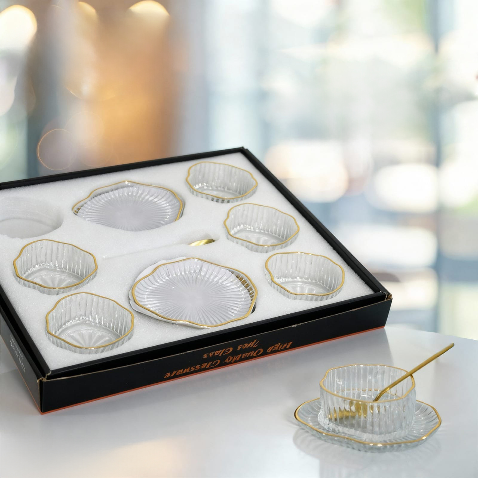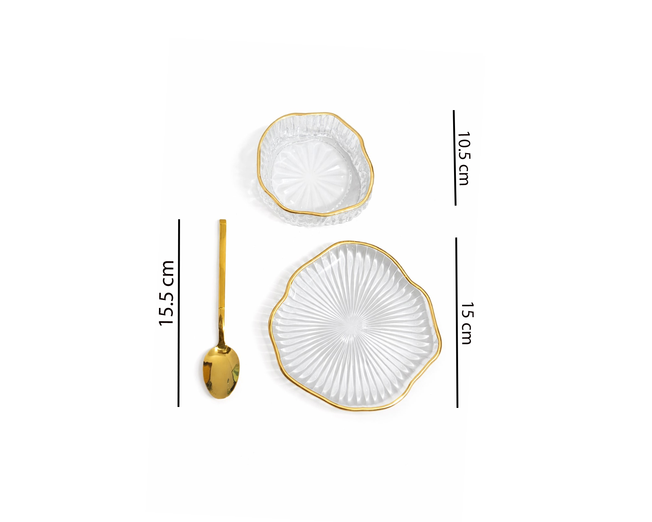 GOLD RIM GLASS DESSERT CUPS WITH PLATES AND SPOONS MODEL A – SET OF 6