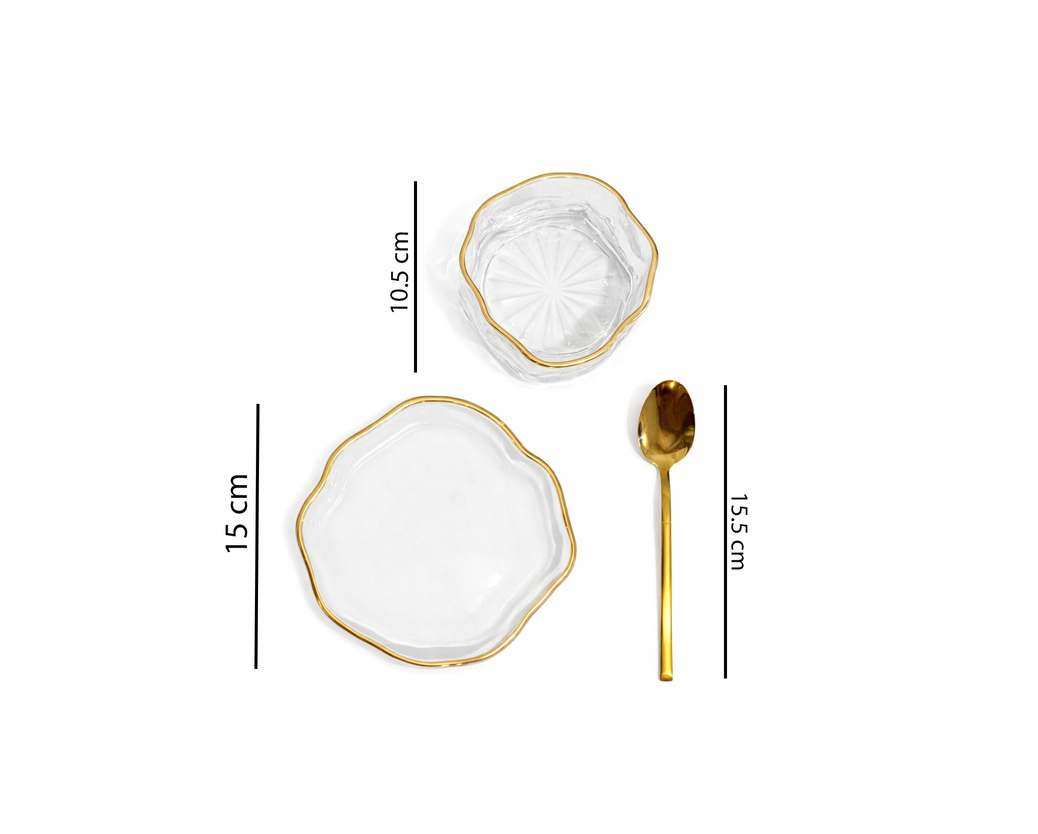 GOLD RIM GLASS DESSERT CUPS WITH PLATES AND SPOONS MODEL C – SET OF 6