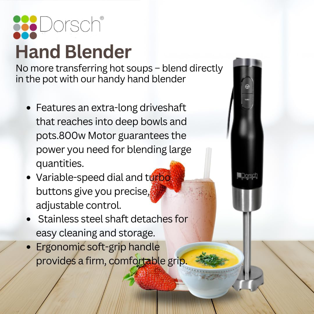 Blend like a pro in seconds. The Dorsch Hand Blender 800W is your ultimate kitchen companion for soups, sauces, smoothies, purees, and more. Designed for power, precision, and comfort, this blender delivers effortless blending with a sleek ergonomic design and complete speed control. Whether you’re whipping eggs, mashing vegetables, or crushing ice, this kitchen magic wand handles it all with confidence.
