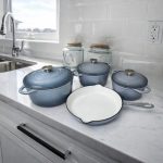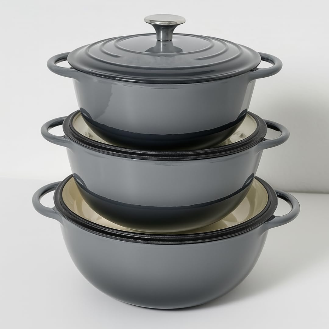 •7-piece versatile set includes: 3 enamel casserole pots with lids and 1 frying pan