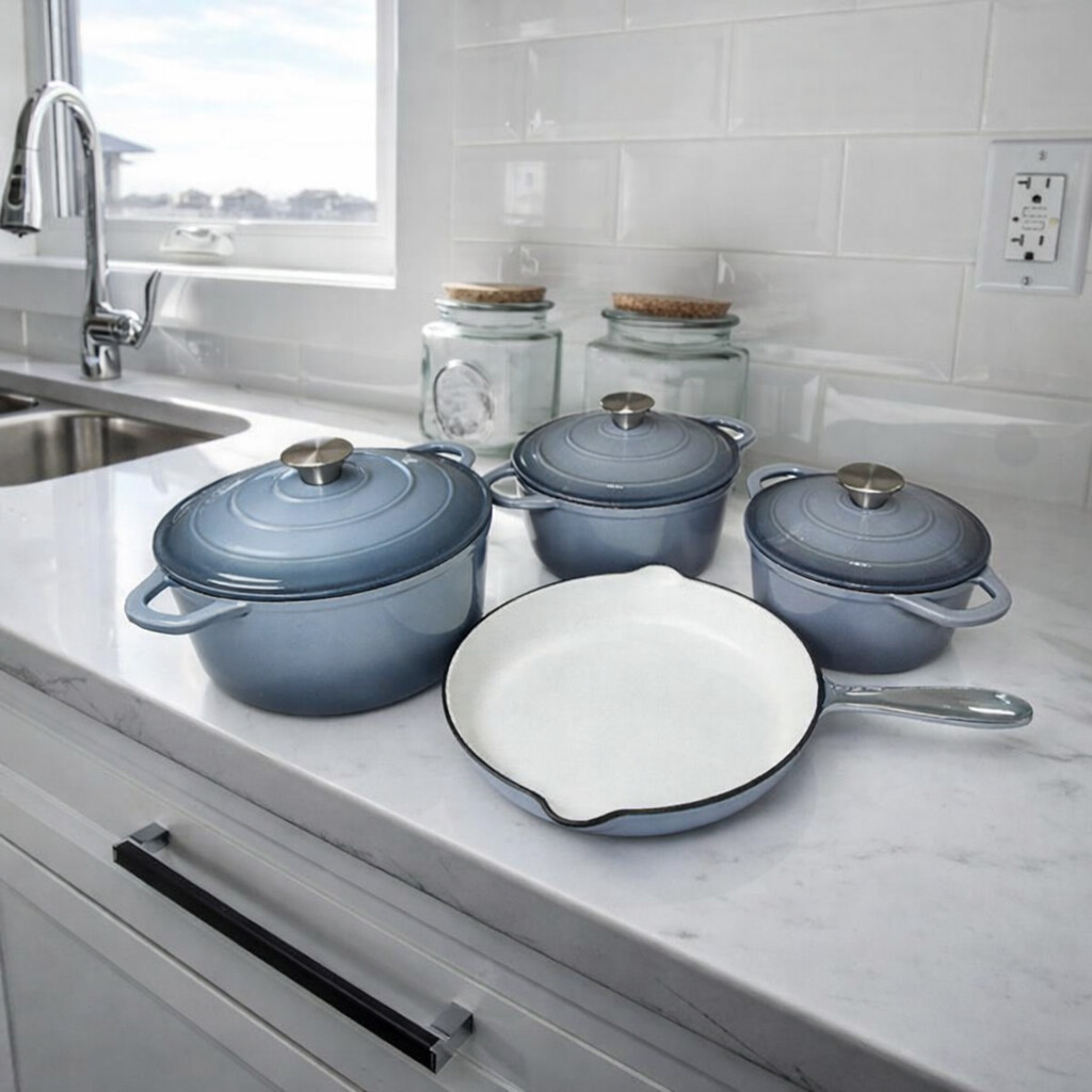 7-PIECE HEAVY WEIGHT CAST IRON COOKWARE SET – ENAMEL COATED OVENS & FRYING PAN