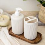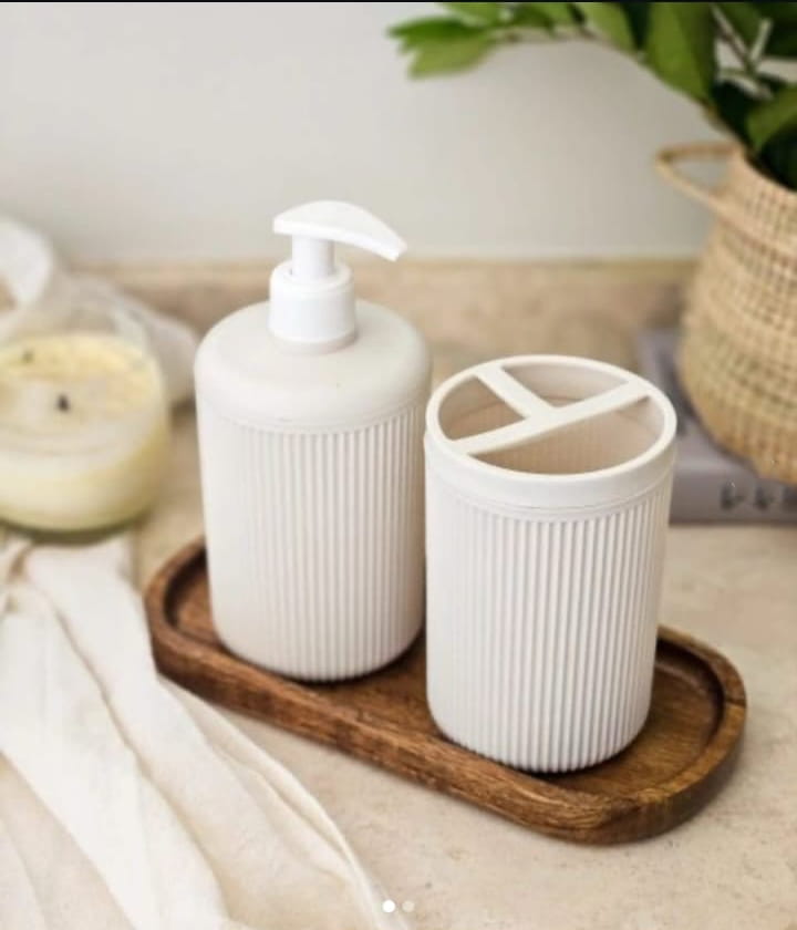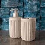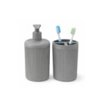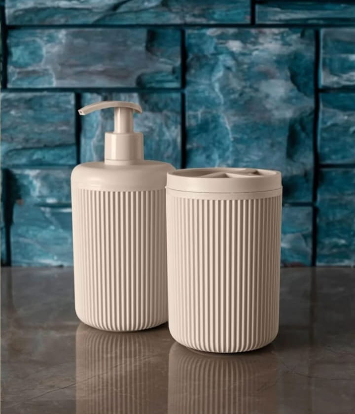 Upgrade your bathroom with modern elegance and smart organization. This 2-piece bathroom set is designed to bring both style and functionality into your daily routine. Featuring a sleek dispenser and a matching toothbrush holder, it helps keep your essentials neatly arranged while enhancing your space with a clean, contemporary look. Crafted with a refined ribbed texture and high-quality finish, this set blends effortlessly with any interior style, from minimal to classic. Whether placed on a vanity or sink, it adds a touch of sophistication while keeping everything within easy reach.