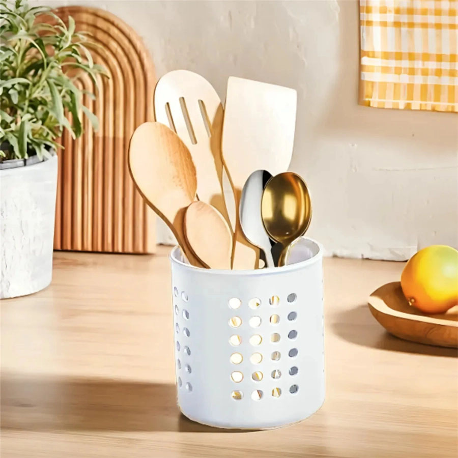 Keep your kitchen neat and organized effortlessly! This utensil drying rack holder is designed to simplify your daily kitchen routine by keeping your cutlery, spoons, and cooking tools clean, dry, and within easy reach. Featuring a smart perforated design with evenly distributed drain holes, it allows water to flow out quickly, ensuring fast and hygienic drying. Its compact cylindrical shape fits perfectly on countertops or near the sink, making it ideal for modern kitchens. Made from durable and easy-to-clean plastic, this holder combines functionality with a clean, stylish look. Whether you’re organizing spatulas, forks, or chopsticks, this versatile basket is a must-have. Shop now from Homedash in lebanon and upgrade your kitchen organization today.