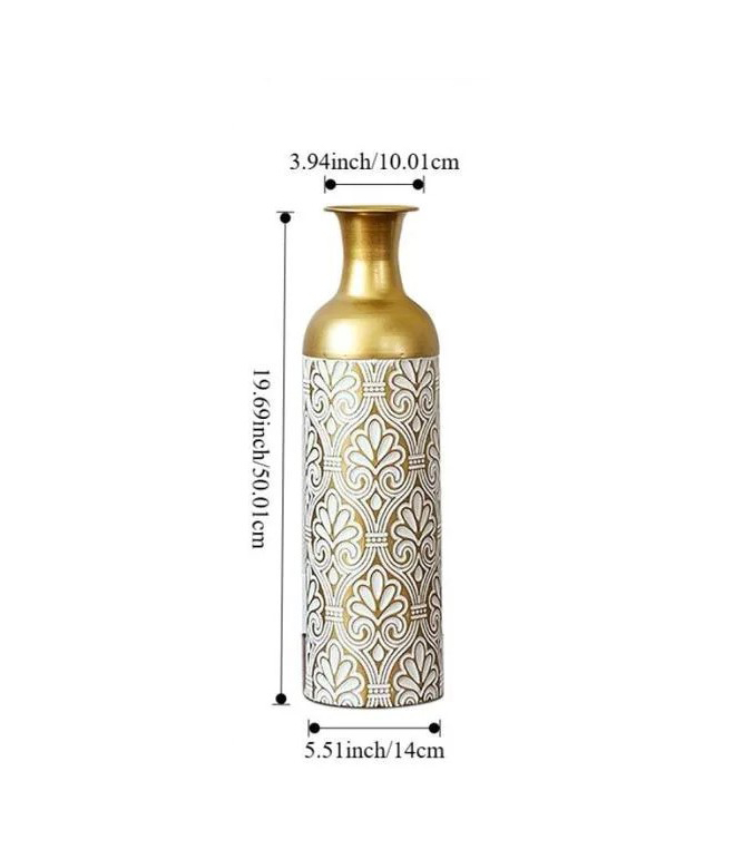 DECORATIVE SMALL METAL FLOOR VASE WHITE AND GOLD ART DECO CYLINDRICAL