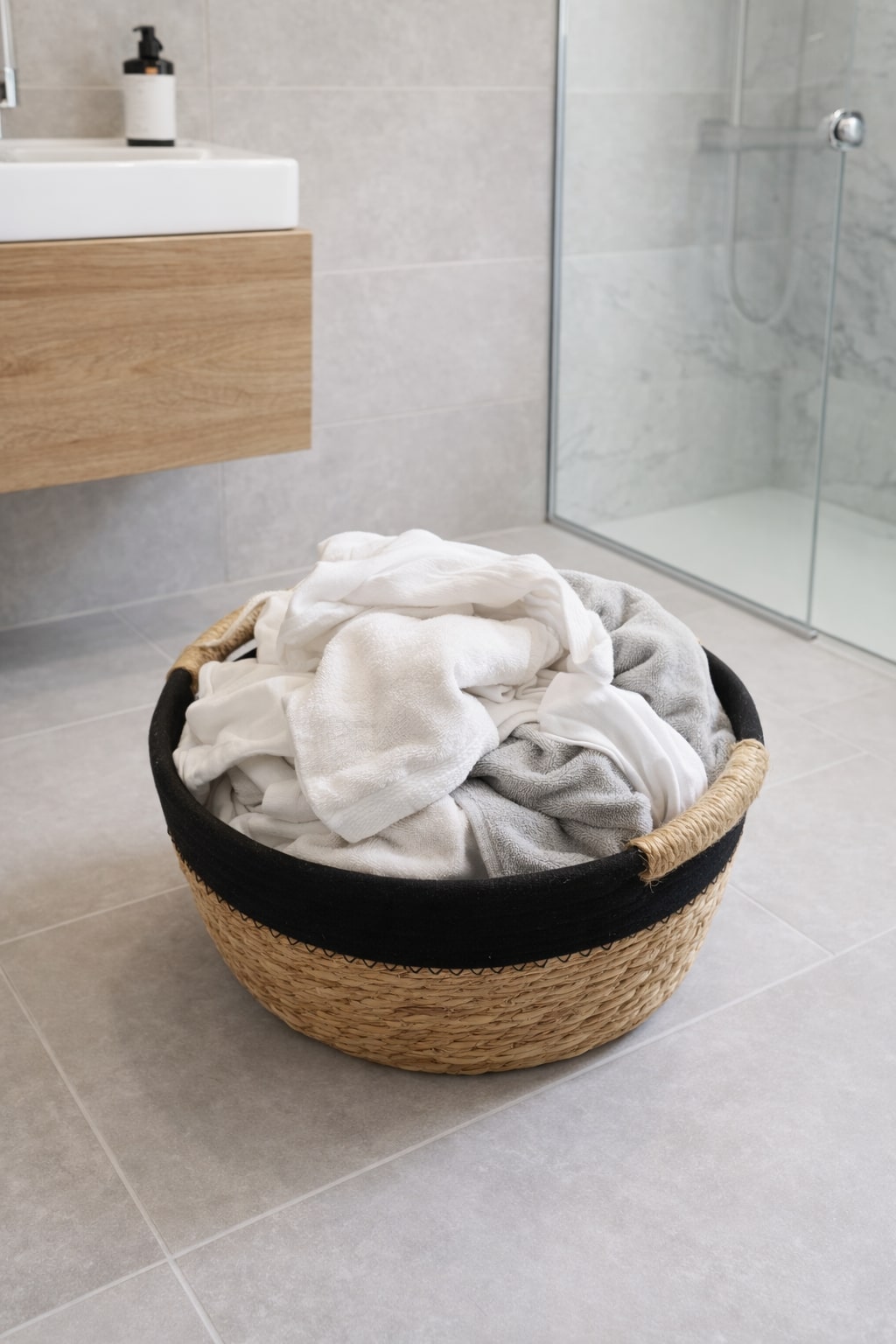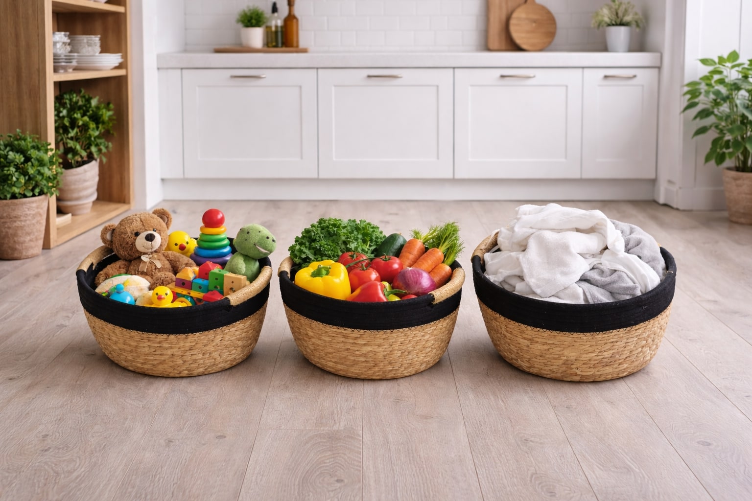 NATURAL MEDIUM WOVEN STORAGE BASKET WITH HANDLES FOR TOYS, LAUNDRY & SMALL PLANTS