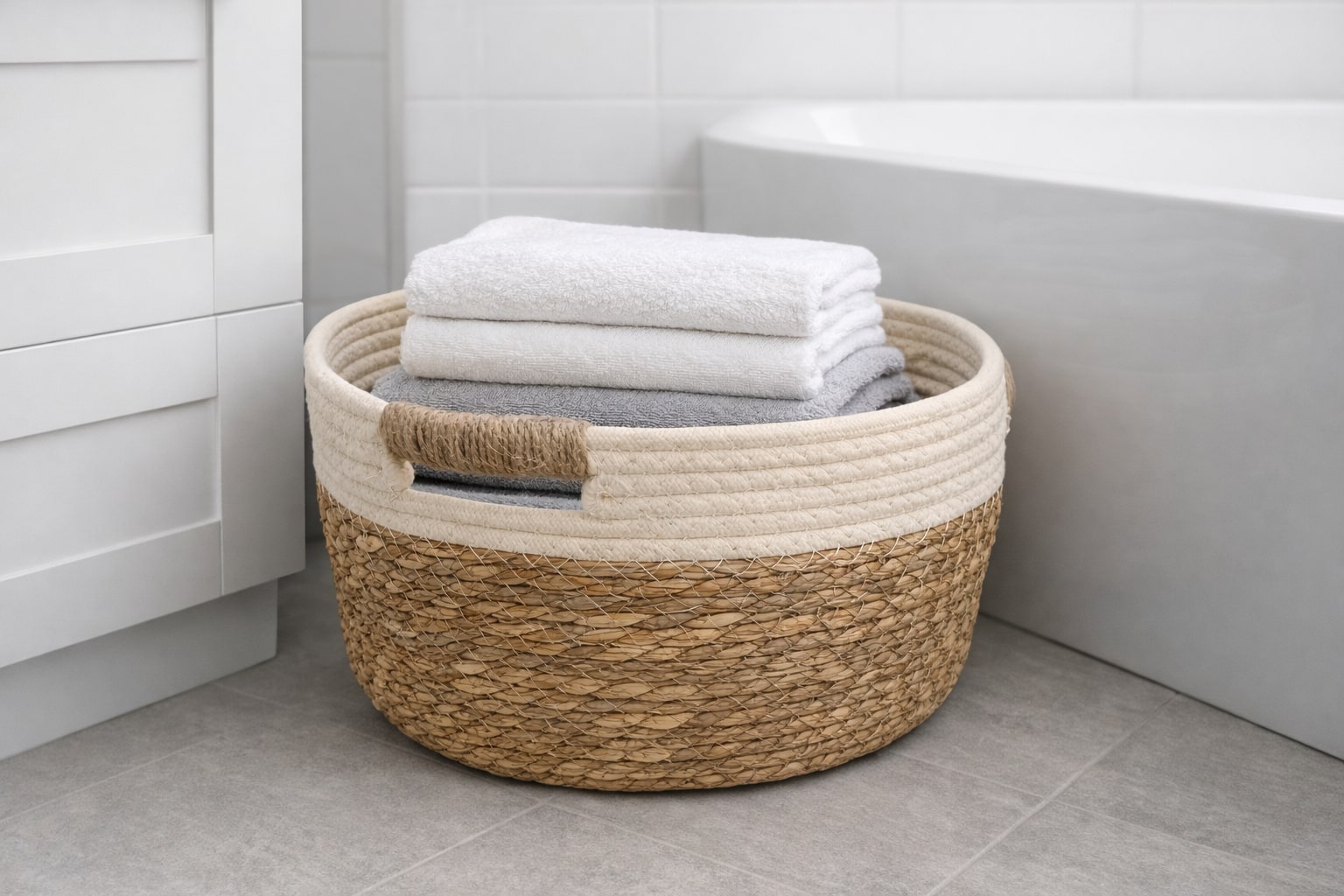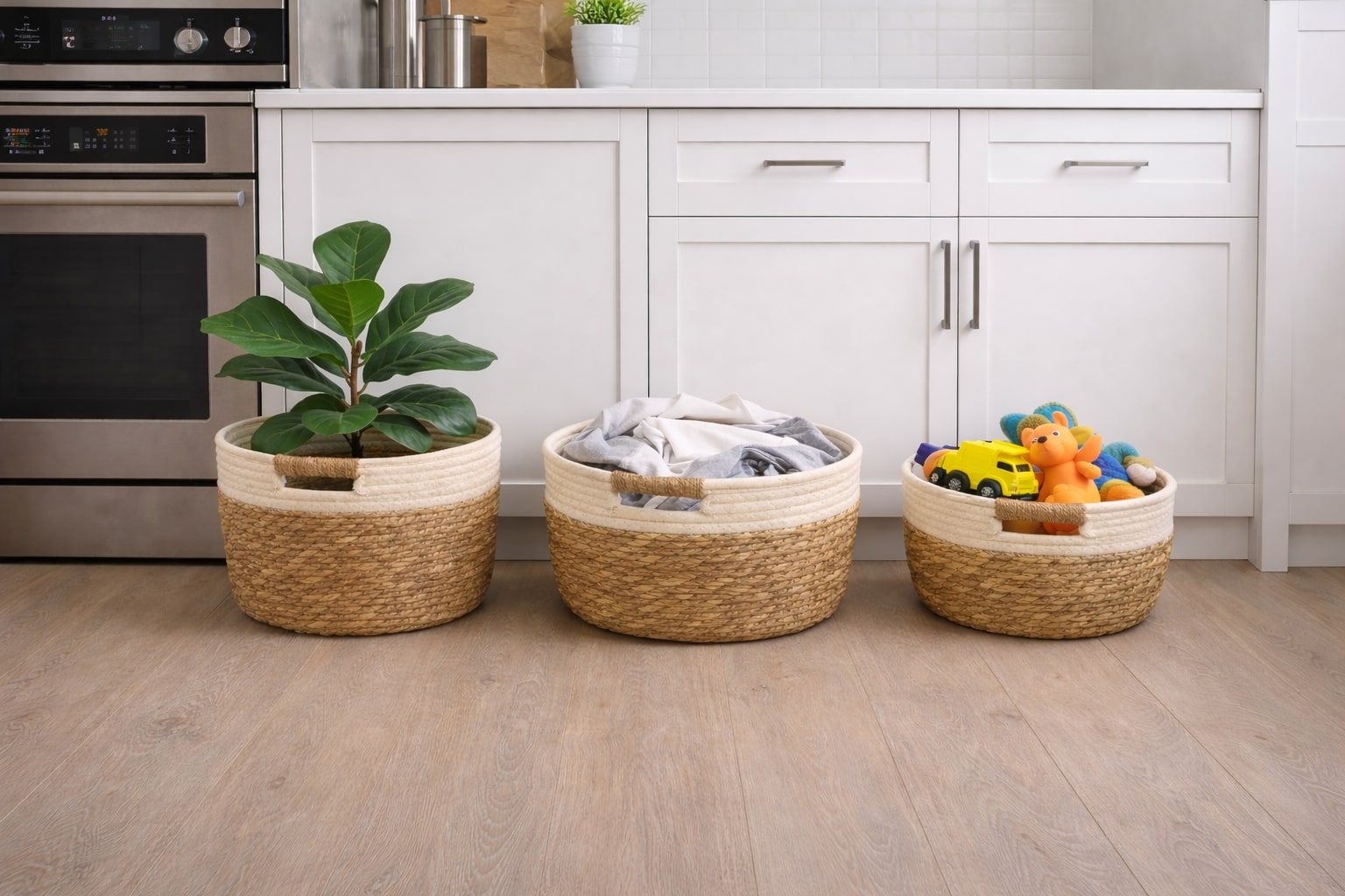 LARGE BEIGE NATURAL WOVEN STORAGE BASKET WITH HANDLES FOR TOYS, LAUNDRY & PLANTS