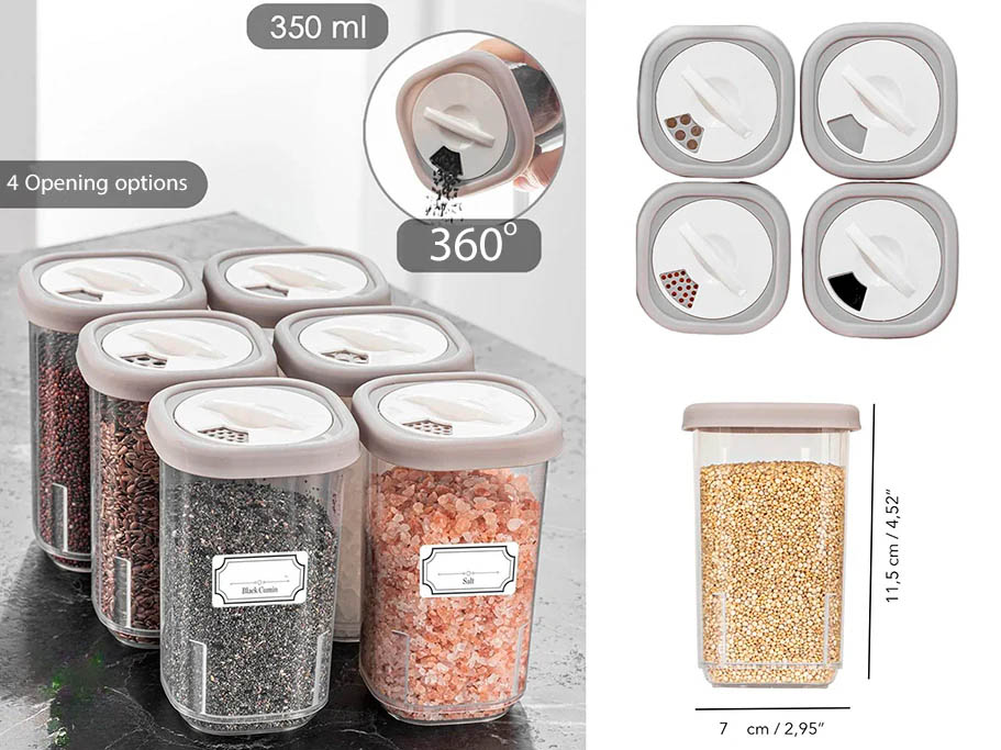 •Rotate lid with 3 opening options (pour, sprinkle, wide open)