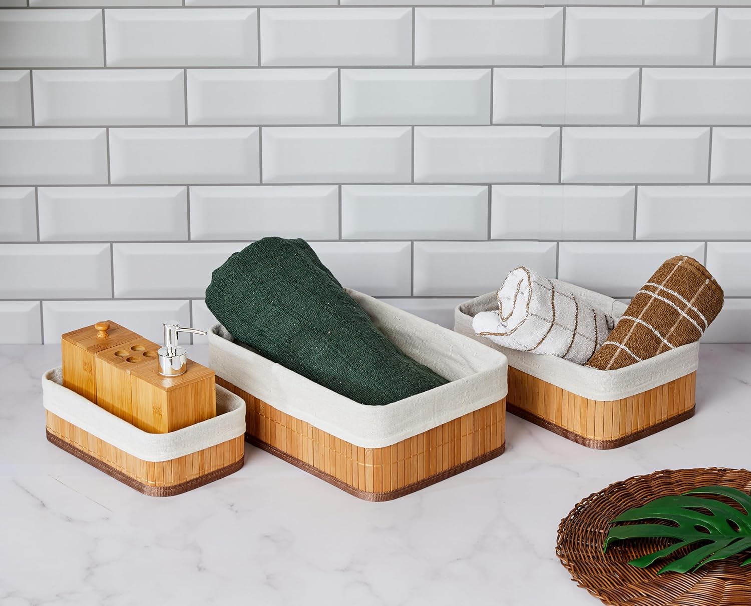 SMALL BAMBOO STORAGE BASKET WITH FABRIC LINER – RECTANGULAR ORGANIZER FOR CLOSET, TOYS, SNACKS & BATHROOM