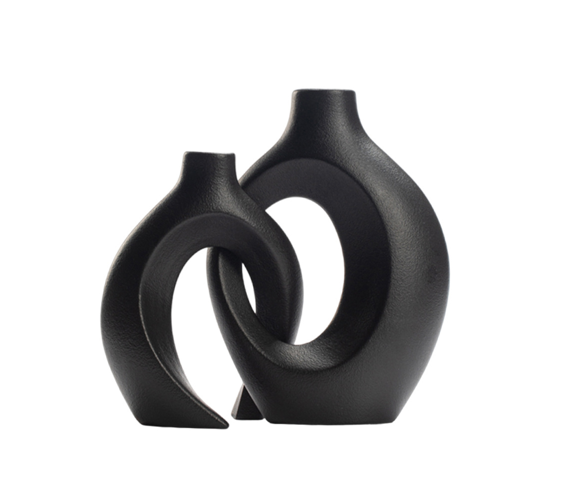 •Set includes 2 uniquely shaped ceramic vases with artistic circular design