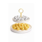 Elevate your serving experience with this elegant dual-tier ceramic dessert stand, designed to bring luxury and organization to your table. Crafted from high-quality white porcelain with a glossy finish, this stand features two perfectly sized tiers accented with refined gold rims and a sturdy gold central pillar. The top ring handle adds both style and convenience, making it easy to carry and present desserts beautifully. Ideal for serving cakes, pastries, chocolates, or appetizers, this stand is perfect for gatherings, tea time, or special occasions. Its minimalist modern design blends seamlessly with any décor, adding a sophisticated touch to your dining or living space. Shop now from Homedash in Lebanon and upgrade your hosting style.