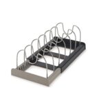 ADJUSTABLE ORGANIZER FOR POTS, PANS & LIDS - ORGANIZER RACK WITH 7 DIVIDERS – EXPANDABLE KITCHEN CABINET ORGANIZER