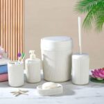BATHROOM ACCESSORIES SET 5 PIECES – DURABLE PLASTIC BATH ENSEMBLE WITH SOAP DISPENSER & TRASH CAN