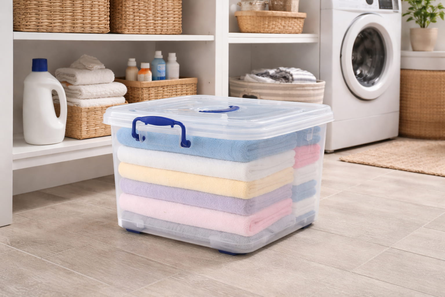 Upgrade your organization game with this versatile clear storage bin! Designed for modern homes, this 30L transparent storage box makes it easy to store, sort, and access your everyday essentials without hassle. Whether you’re organizing your kitchen, kids’ toys, office supplies, or seasonal items, this bin keeps everything visible and neatly arranged. Made from high-quality durable plastic, it features strong blue clip-lock handles that securely seal the lid to protect contents from dust and moisture. The built-in wheels allow smooth movement, making it easy to transport even when full. Stackable and space-saving, this storage solution is perfect for keeping your home clean and clutter-free. shop now from Homedash in lebanon.