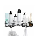 CORNER BATHROOM SHELF – WALL SELF-ADHESIVE ORGANIZER STORAGE WITH SIDE HANGERS – BLACK