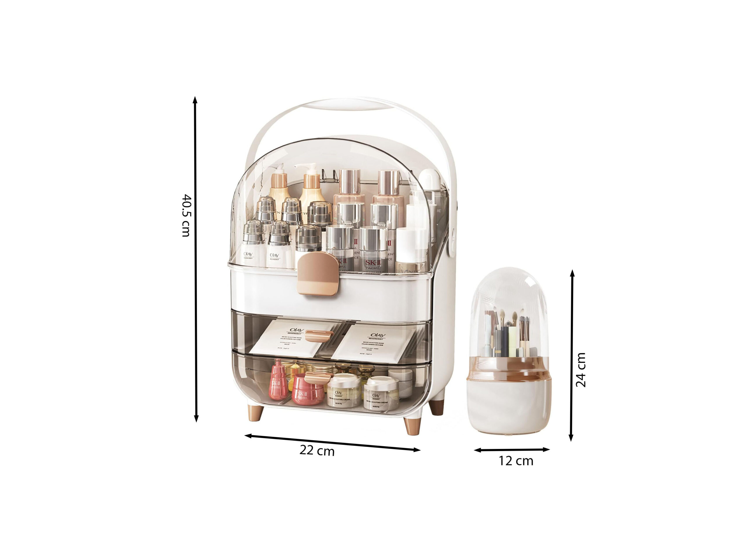 COSMETICS ORGANIZER SET – MAKEUP BOX WITH BRUSH HOLDER AND TRANSPARENT DRAWERS, PORTABLE HANDLE