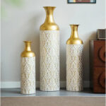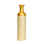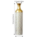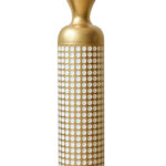 •An elegant metal vase in white and gold, beautifully accented with delicate small white circular details for a modern decorative touch.