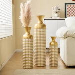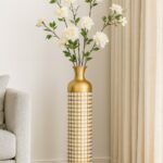 •Elegant cylindrical floor vase with Art Deco fan-inspired pattern with metal base enhanced with sophisticated gold accents and trim