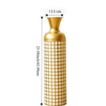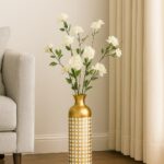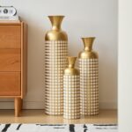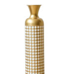 •An elegant metal vase in white and gold, beautifully accented with delicate small white circular details for a modern decorative touch.
