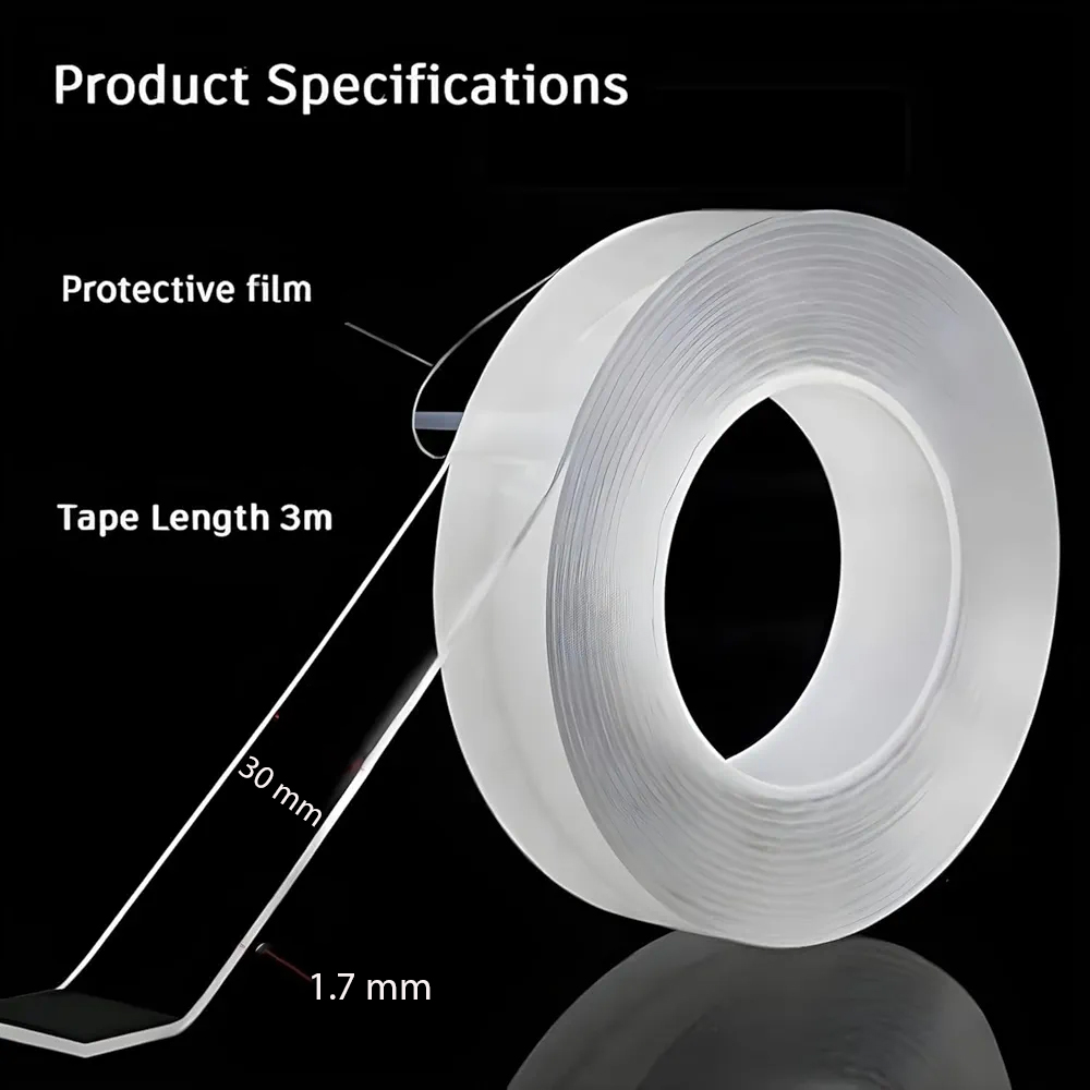 Mount, fix, and organize without drilling or damaging your walls. This double-sided heavy duty transparent mounting tape provides a strong and reliable hold for everyday household and office needs. Designed with powerful adhesive grip, this 3-meter reusable tape can securely attach posters, carpets, decorations, and accessories to various surfaces. Its washable and removable design allows you to reuse it multiple times while maintaining excellent adhesion.