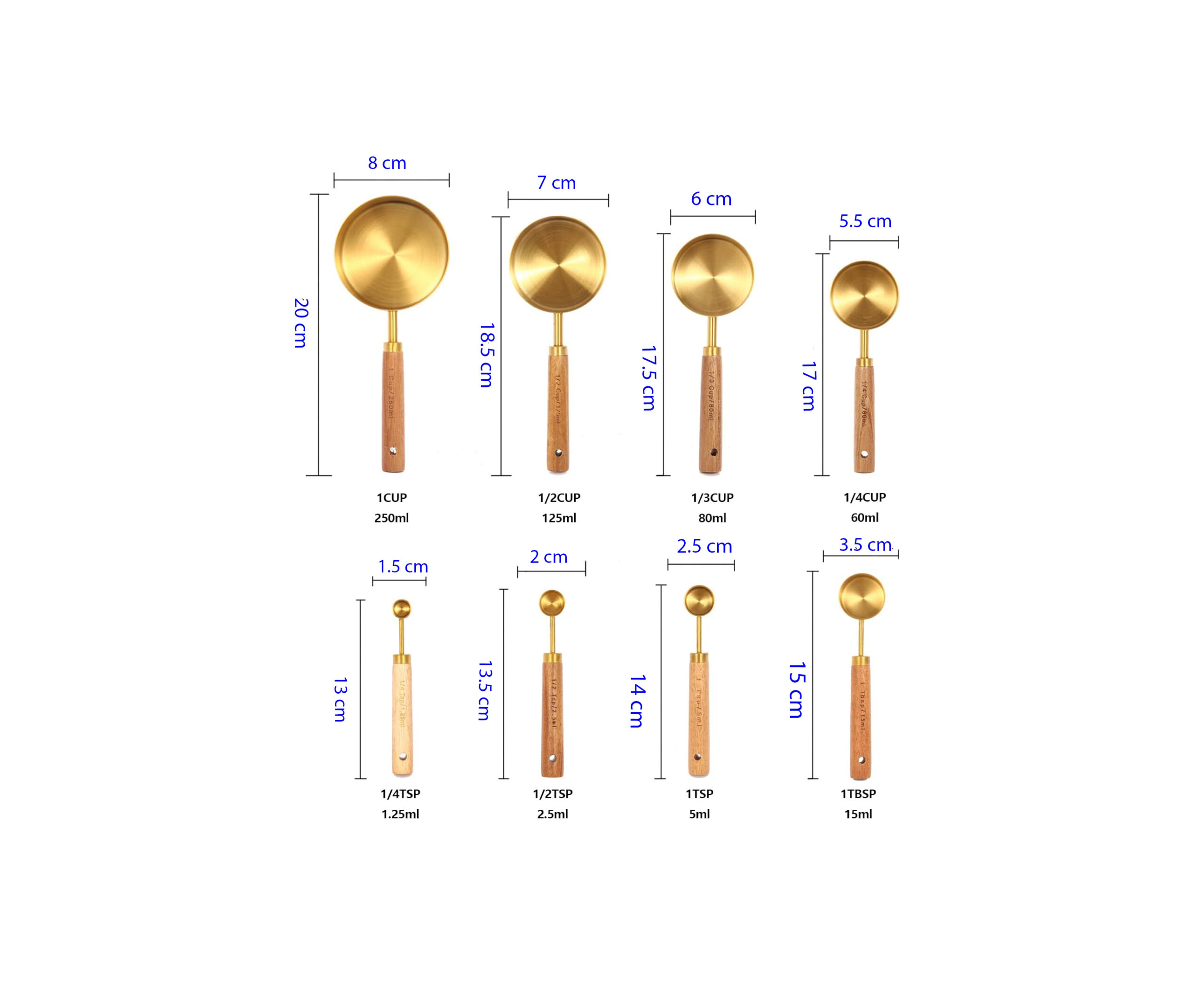 Perfect for baking, cooking, and recipe precision, this set includes four measuring cups and four spoons, covering all essential measurements. The real wood handles ensure a non-slip hold, while the gold cups maintain long-lasting beauty. This set also makes a thoughtful gift for bakers, home chefs, weddings, birthdays, and housewarmings.