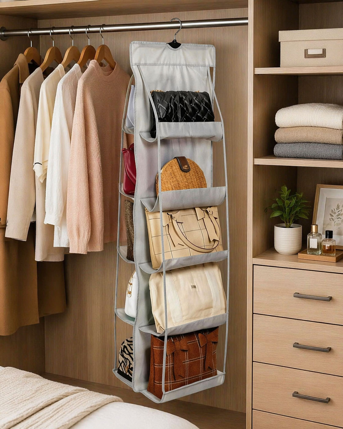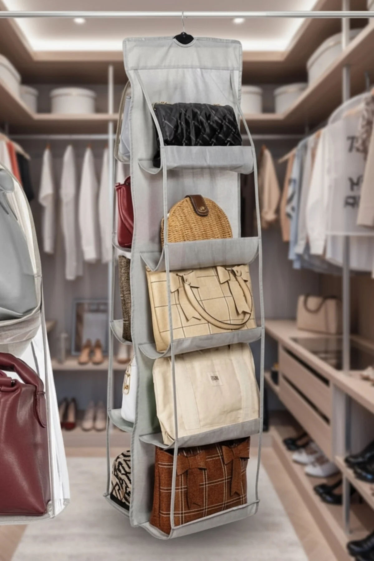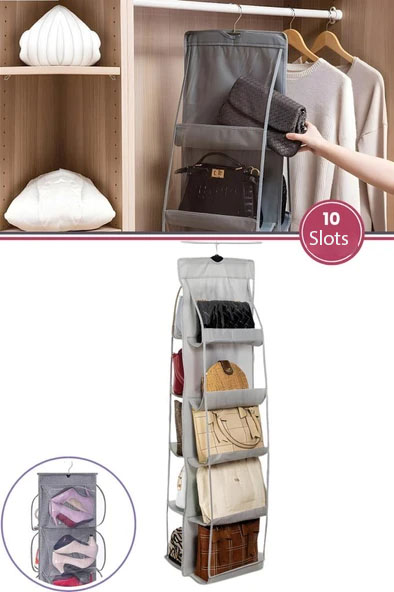 Declutter your closet instantly with smart storage! This hanging purse organizer offers a practical and stylish way to store your handbags while keeping them protected and easy to access. Designed with transparent pockets and durable materials, it helps you quickly find what you need while saving valuable space. Ideal for modern homes, shop now from Homedash in Lebanon and upgrade your organization game effortlessly.