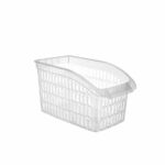 transparent plastic fridge organizer basket filled with vegetables for refrigerator storage organization