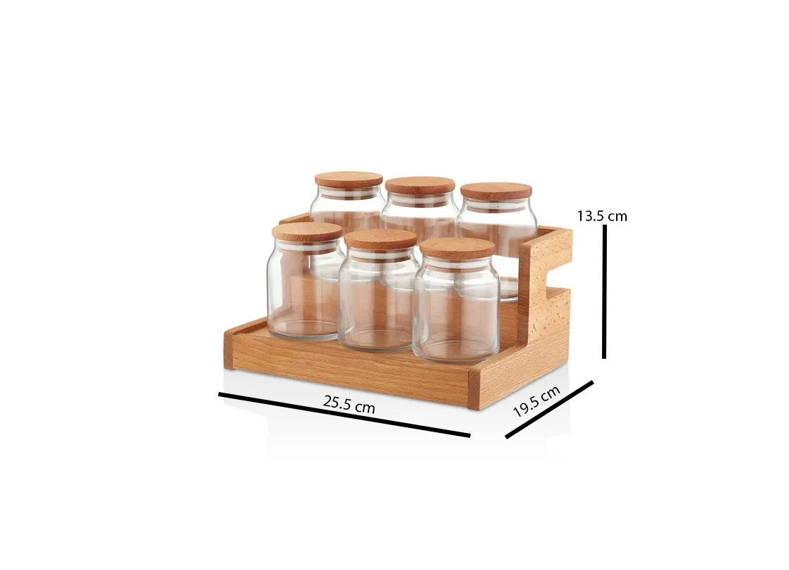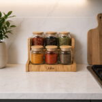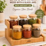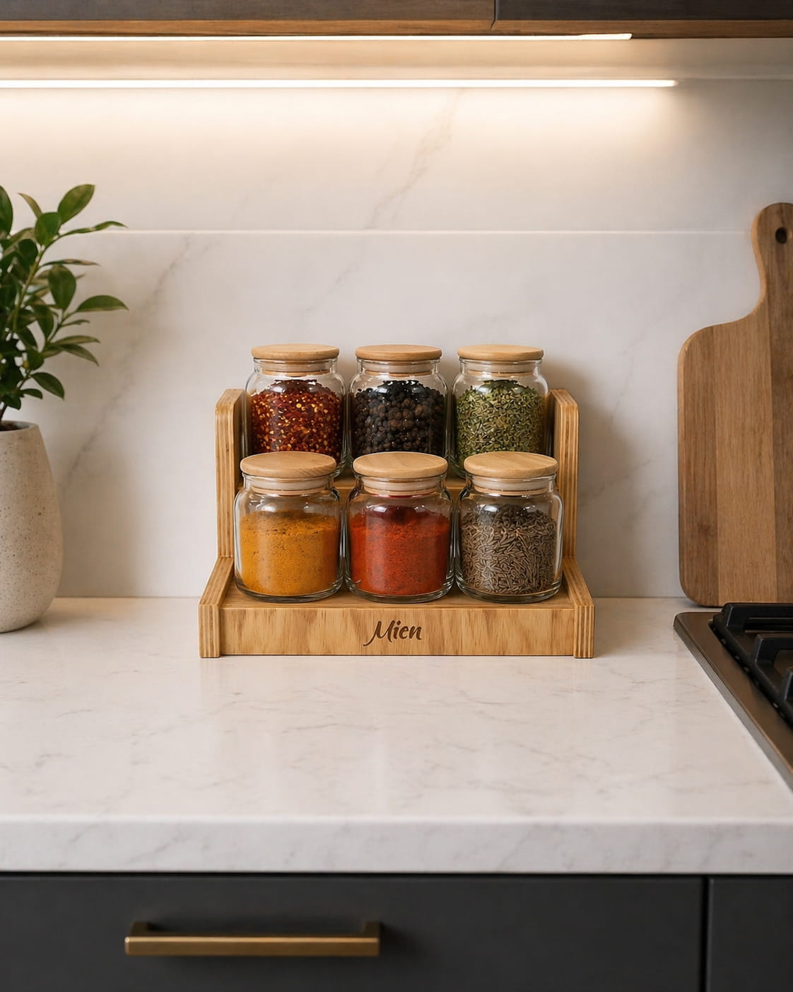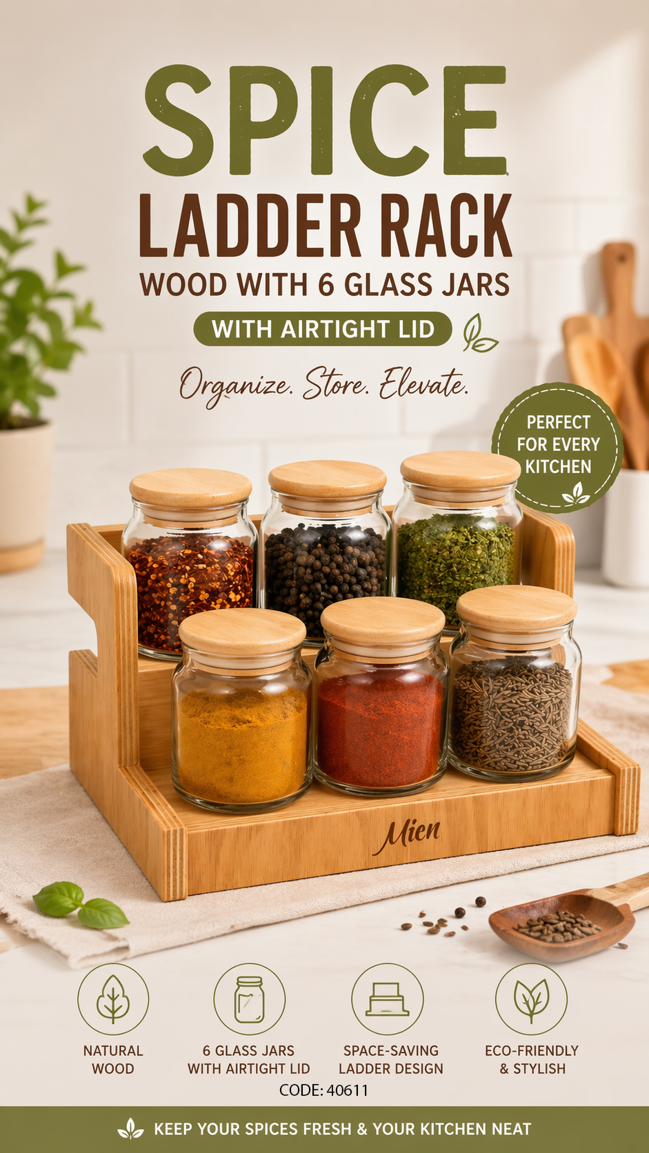 Upgrade your kitchen organization with this elegant wooden spice rack set. Designed with a tiered ladder structure and six clear glass jars, it keeps your spices fresh, visible, and easily accessible. The airtight bamboo lids with silicone seals preserve aroma and quality, while the compact design fits perfectly on countertops. A stylish and practical solution for every home—shop now from Homedash in Lebanon and bring order and beauty to your kitchen.