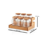 Wooden spice rack with 6 airtight glass jars on tiered stand for kitchen organization